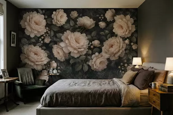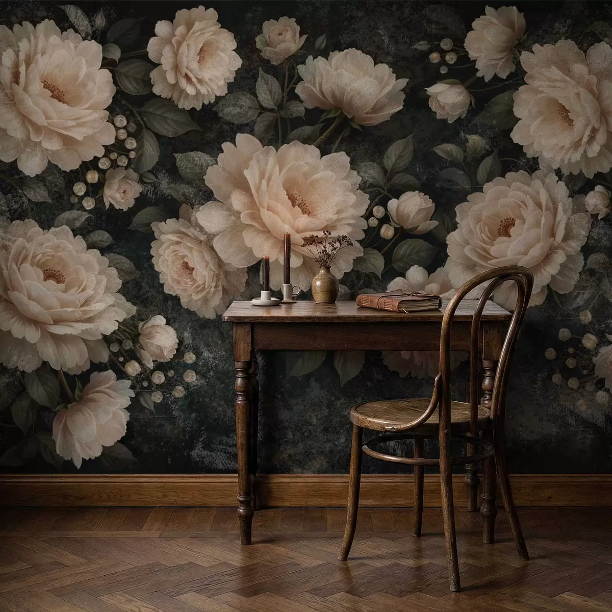 Carta da parati Fiori voluminosi in tonalità beige su sfondo scuro nr. w05114