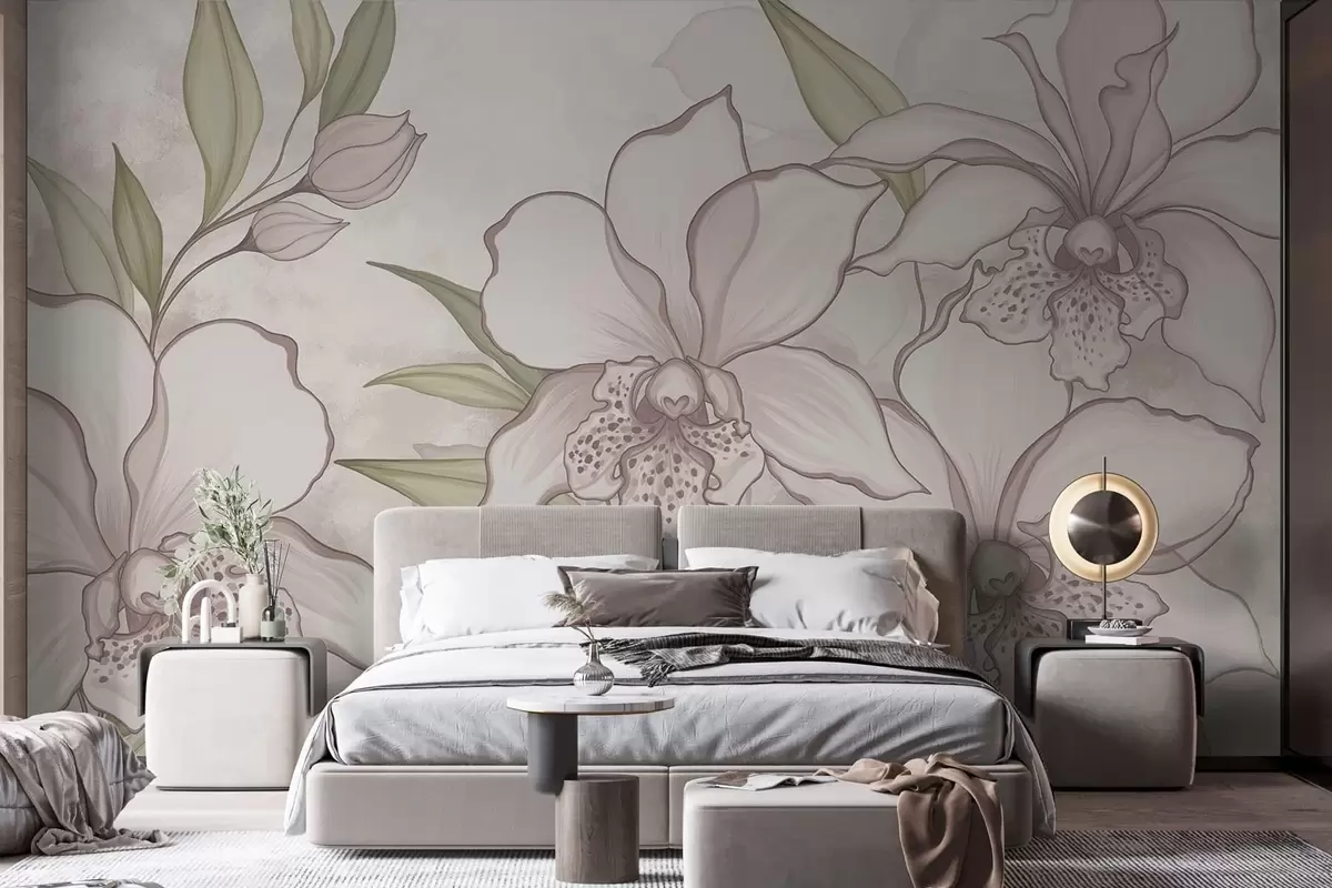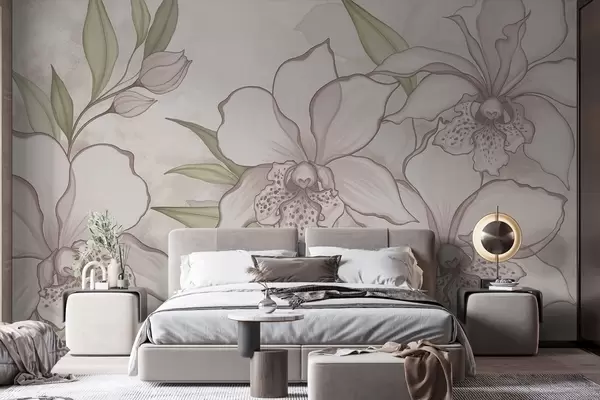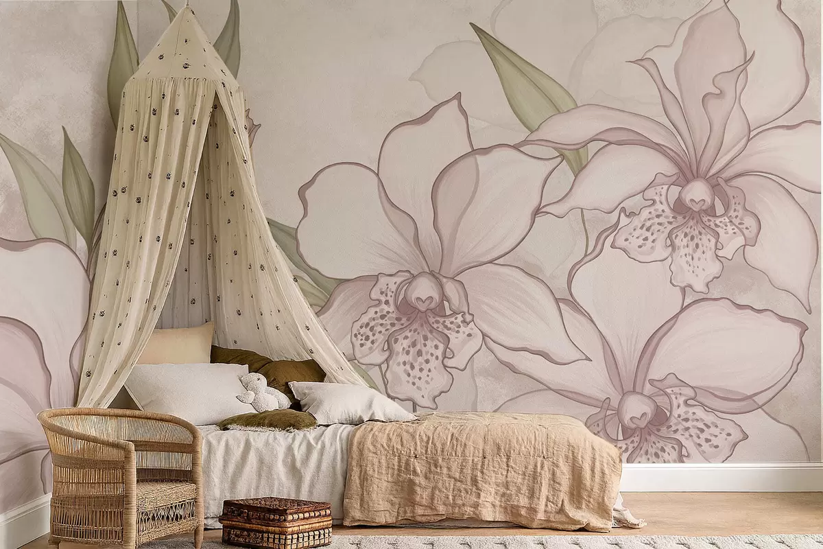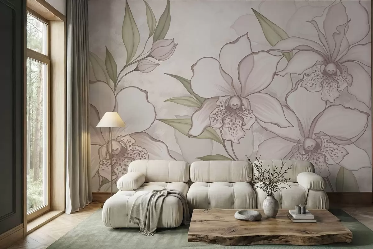 Carta da parati Illustrazione di orchidee pallide con foglie su sfondo beige nr. w05117