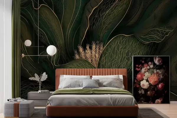 Carta da parati Fiore astratto verde scuro con dettagli dalle linee sottili nr. w05119v1