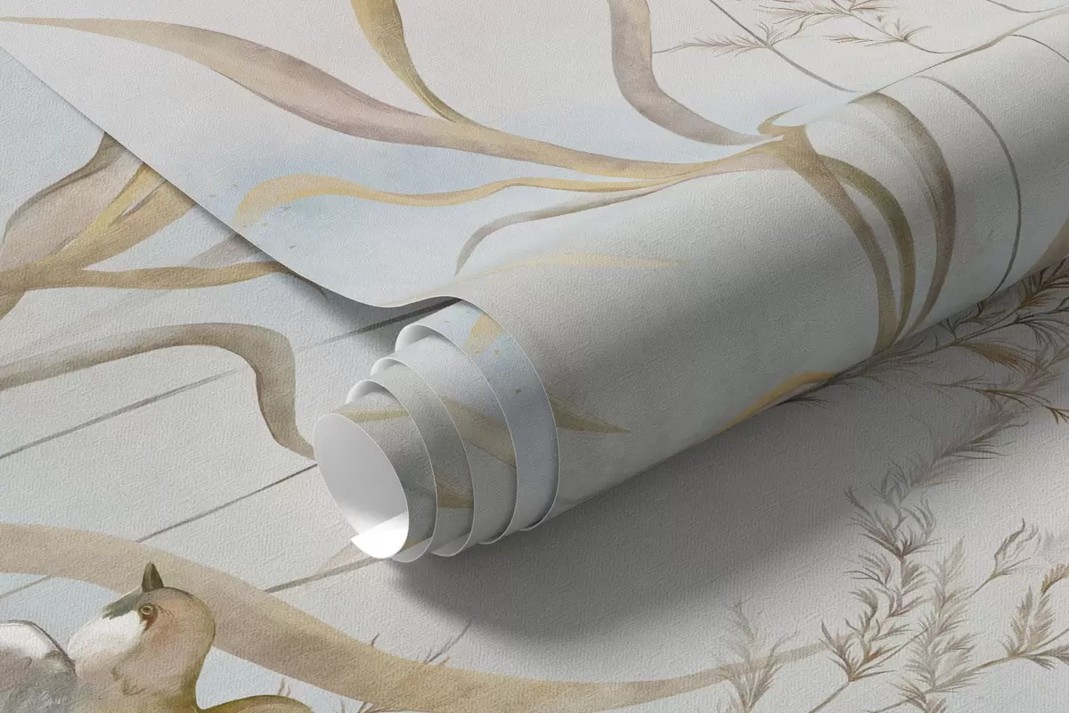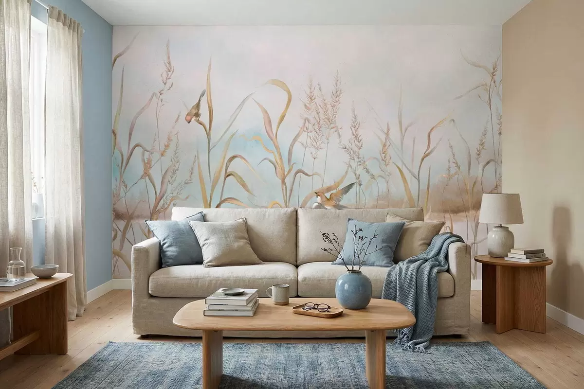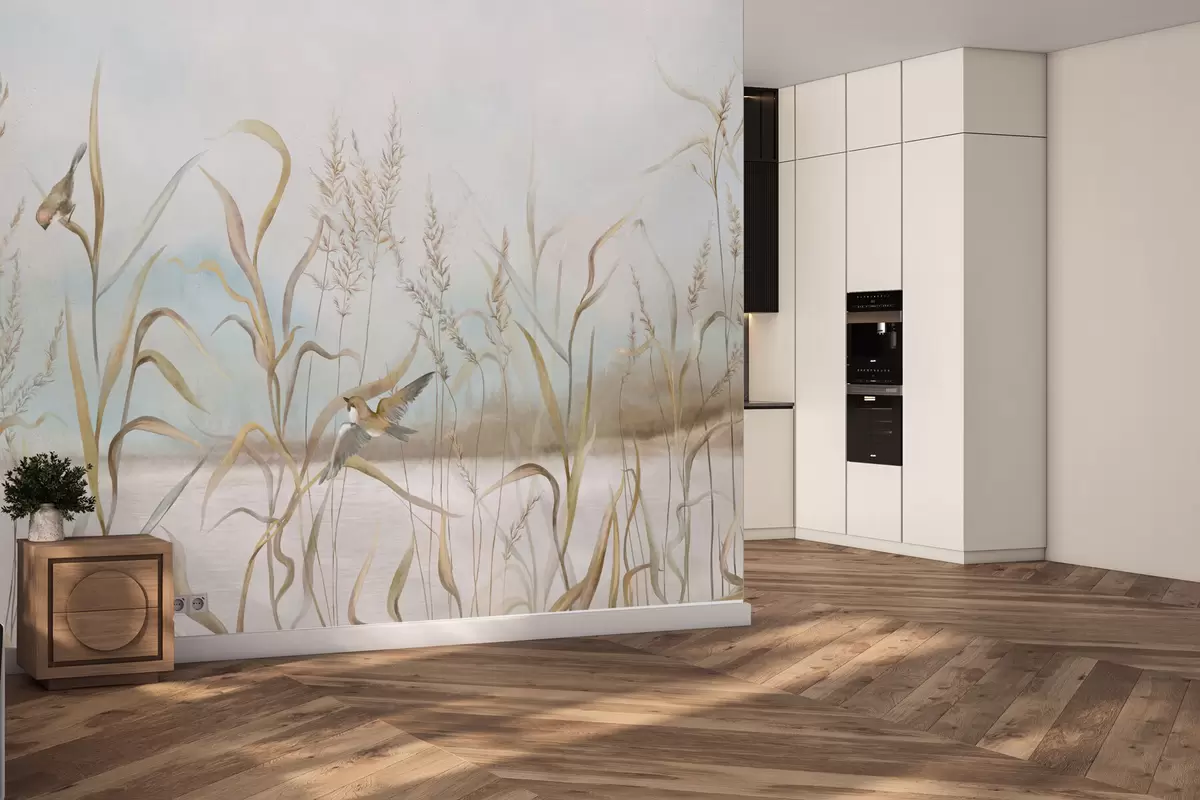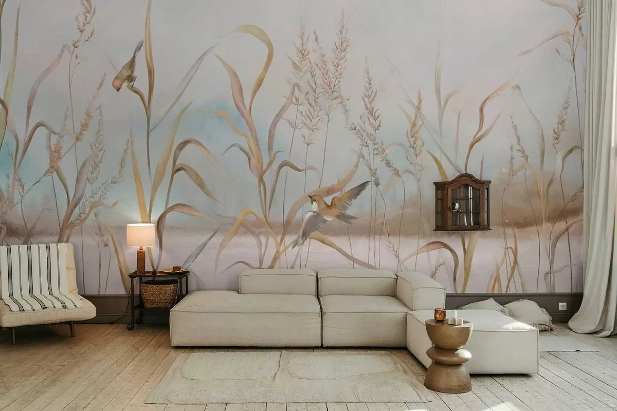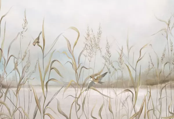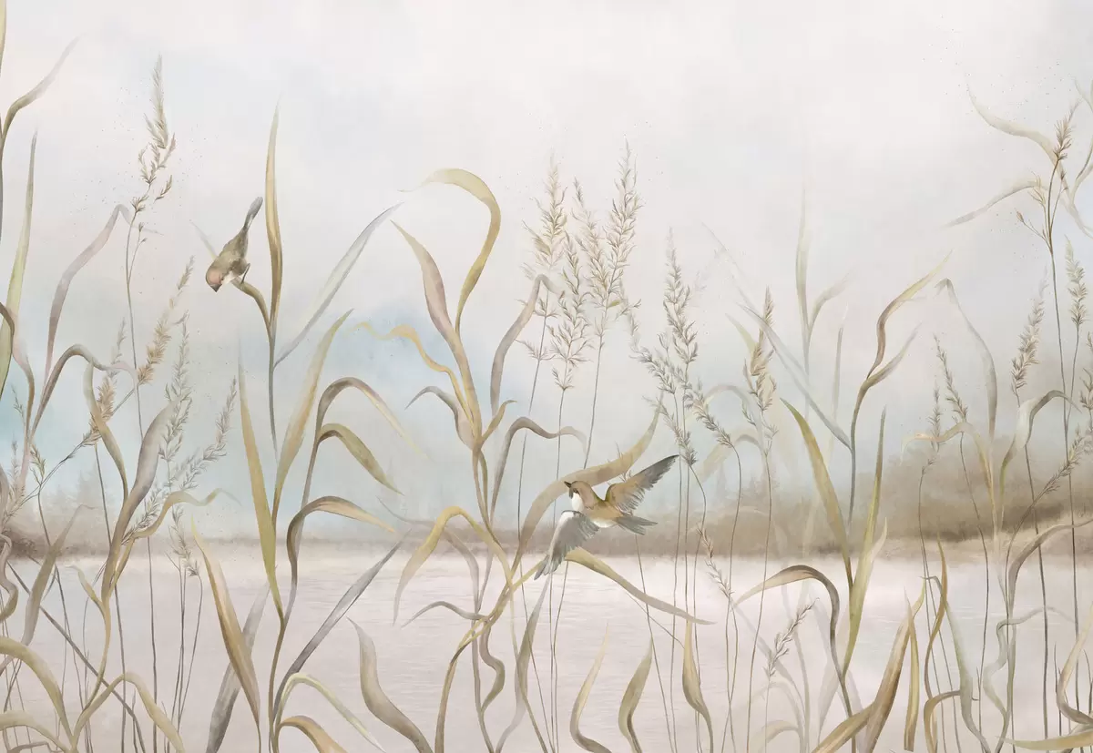 Carta da parati Illustrazione di canne e uccelli sull'acqua in tonalità tenui nr. w05125