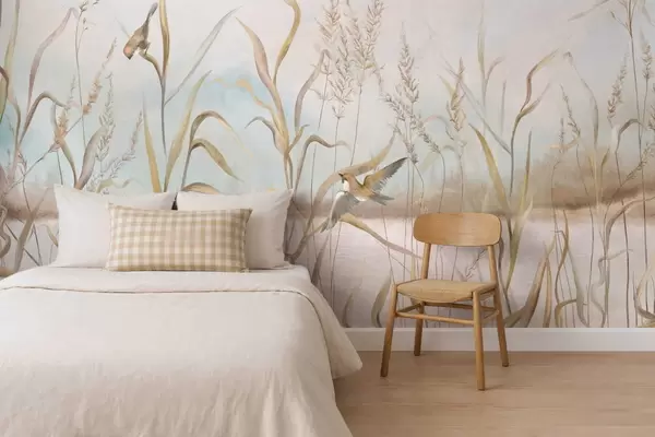 Carta da parati Illustrazione di canne e uccelli sull'acqua in tonalità tenui nr. w05125