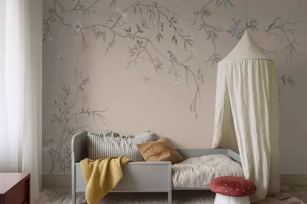 Carta da parati Rami fioriti con uccellini su sfondo beige caldo nr. w05127v1