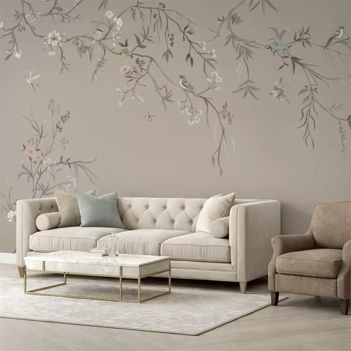 Carta da parati Ornamento floreale con uccelli su sfondo neutro nr. w05127v3