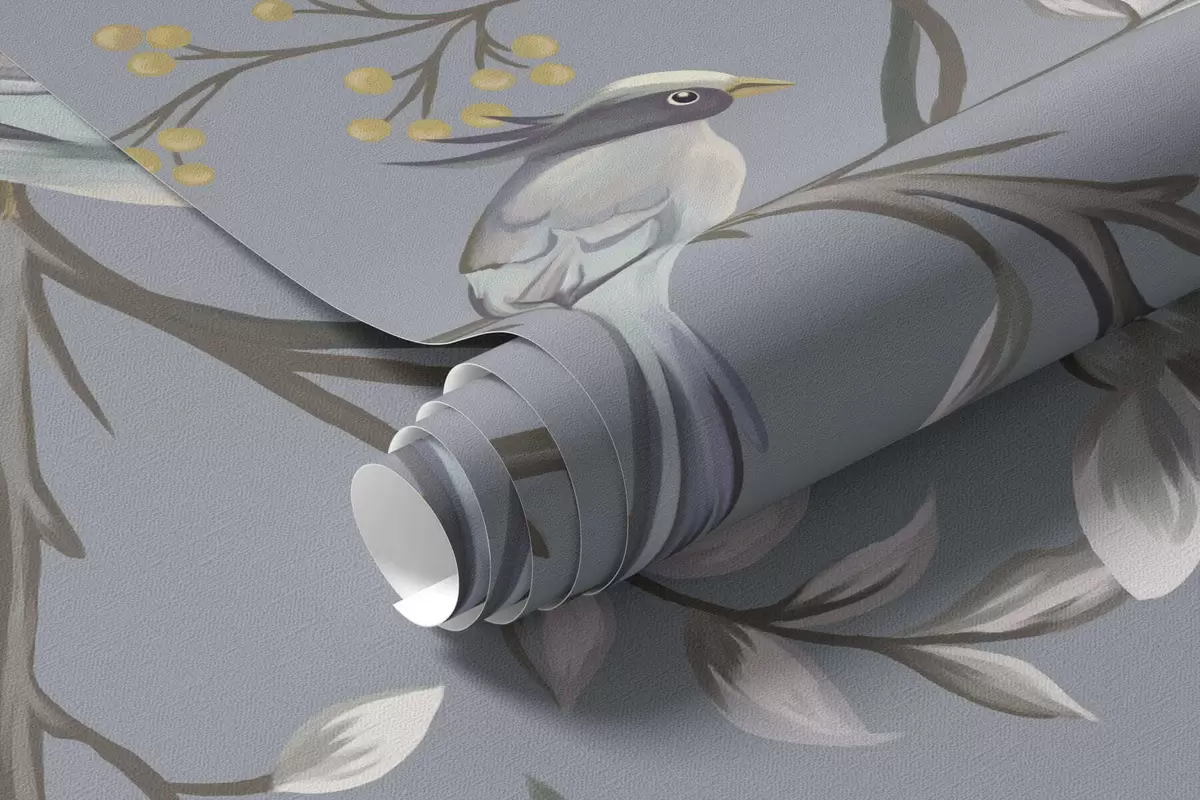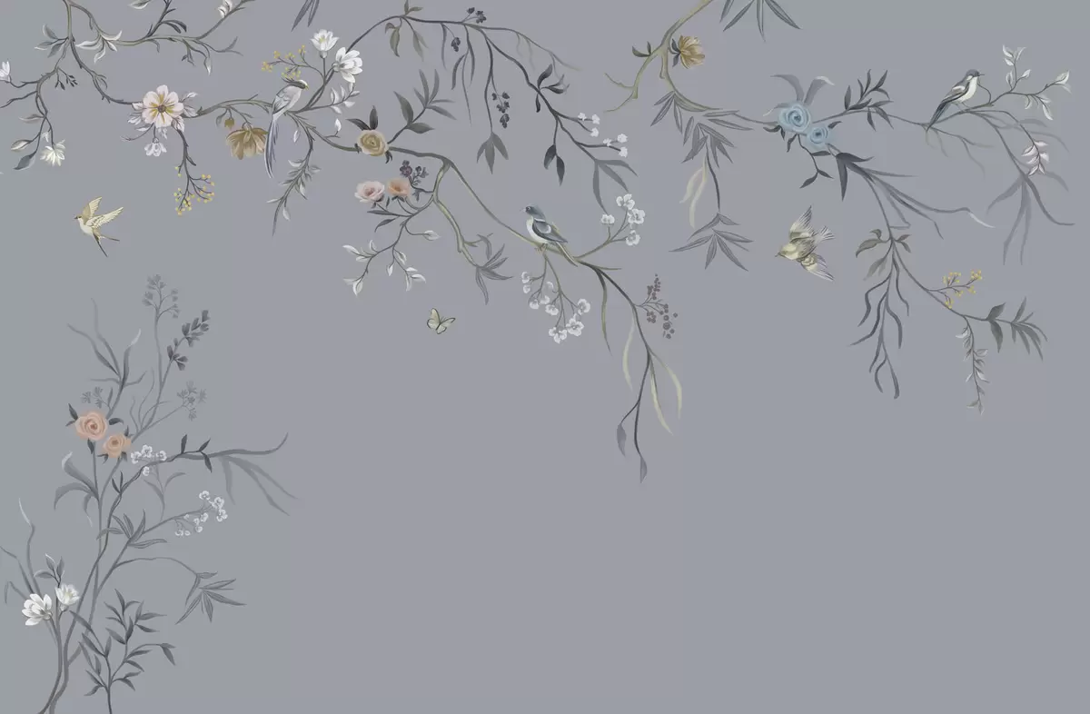 Carta da parati Rami fioriti con uccelli su sfondo verdastro nr. w05127v5