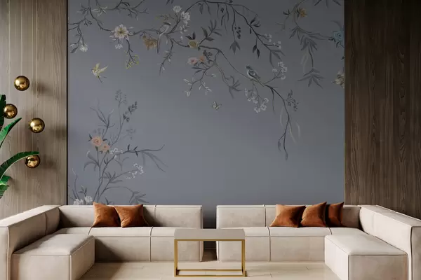 Carta da parati Rami fioriti con uccelli su sfondo verdastro nr. w05127v5
