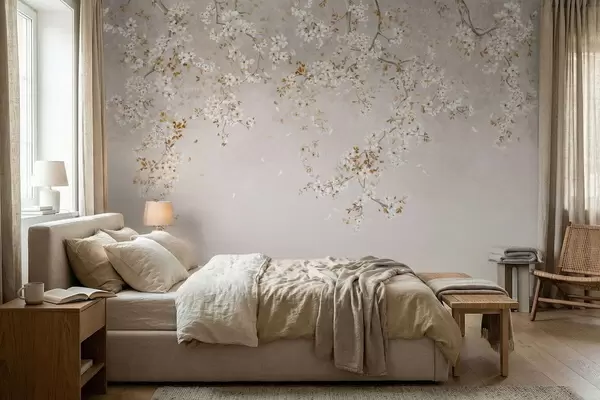 Carta da parati Rami con fiori bianchi su uno sfondo beige chiaro nr. w05129