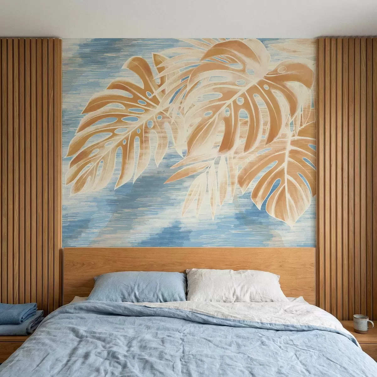 Carta da parati Foglie in tonalità sabbia chiare su sfondo blu nr. w05130v1