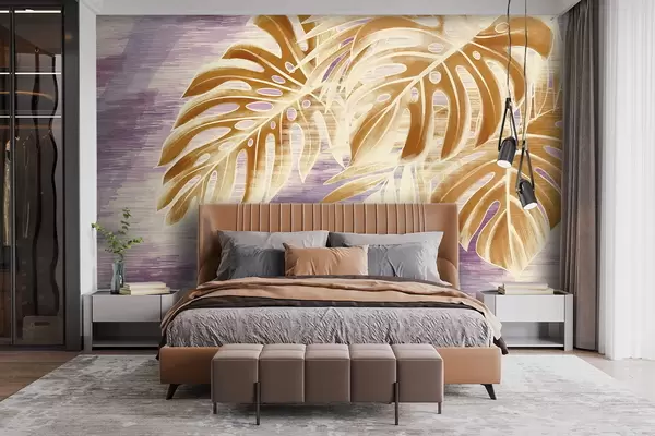 Carta da parati Foglie dai toni caldi dell'arancio su sfondo viola nr. w05130v2