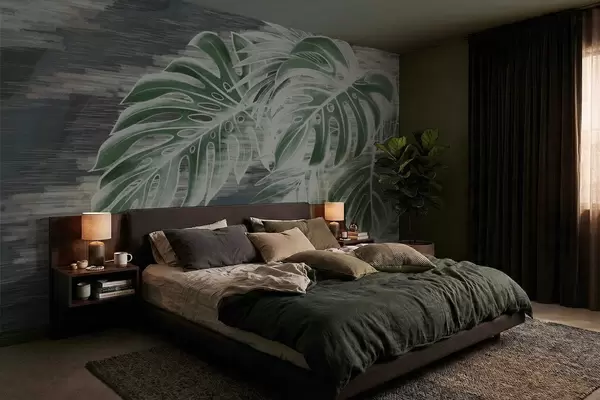 Carta da parati Foglie verde scuro su sfondo scuro testurizzato nr. w05130v4