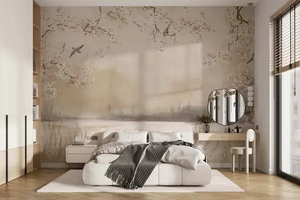 Carta da parati Delicati rami in fiore in riva al lago con uccelli nella leggera nebbiolina nr. w05155