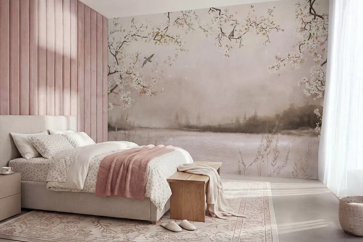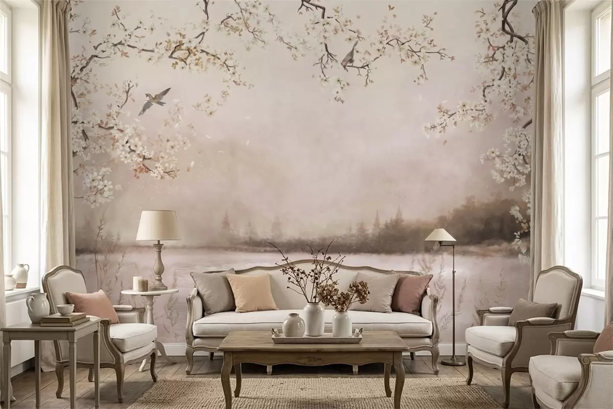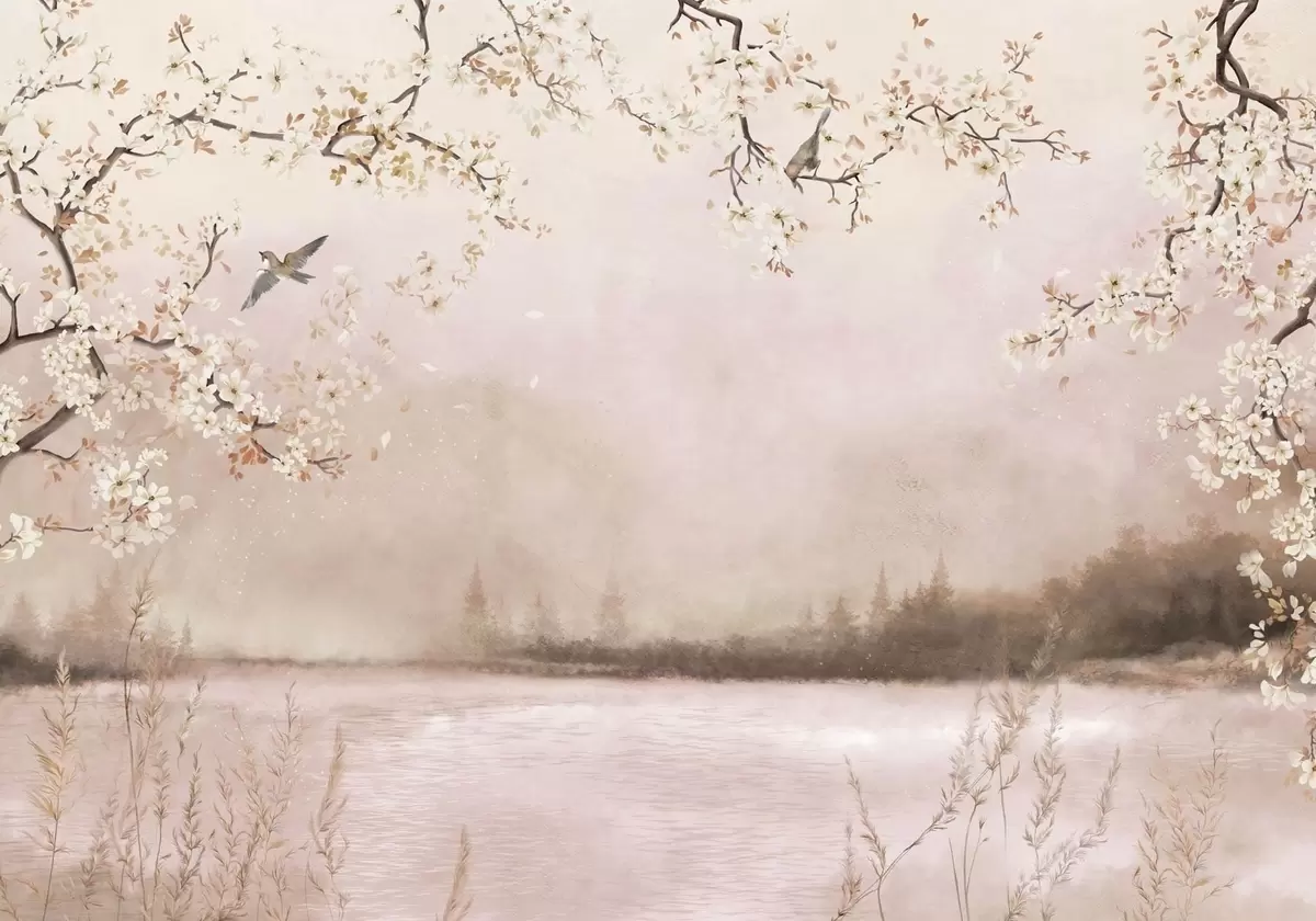 Carta da parati Rami in fiore sopra un lago tranquillo con uccelli nella nebbia nr. w05155v1