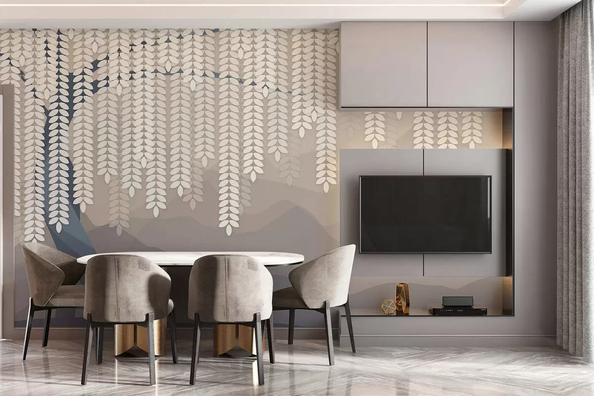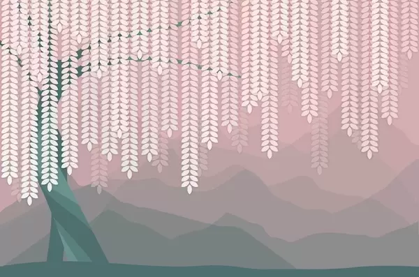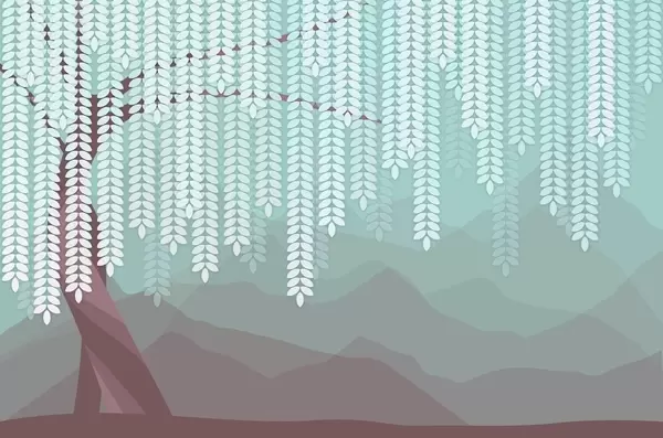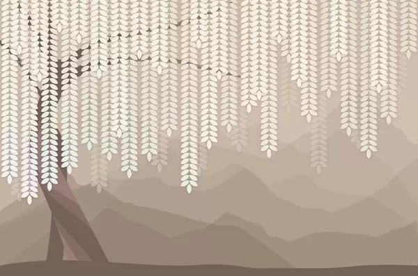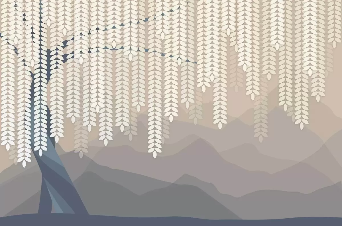 Carta da parati salice stilizzato con foglie pendenti su uno sfondo di montagne minimaliste nei toni del beige e del blu-verde nr. w05232