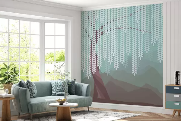 Carta da parati salice stilizzato con foglie pendenti su uno sfondo di montagne minimaliste nei toni del cioccolato e del turchese nr. w05232v1