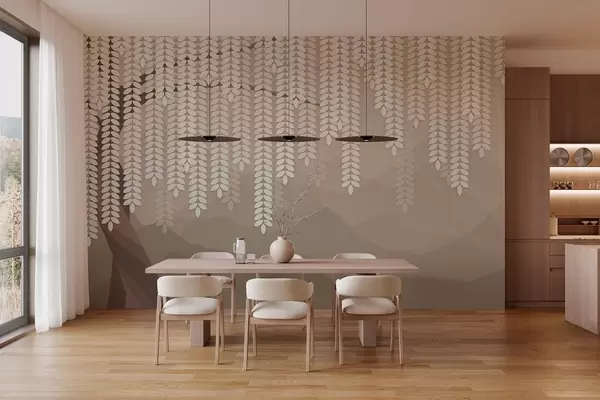 Carta da parati salice stilizzato con foglie pendenti su uno sfondo di montagne minimaliste nei toni del caffè nr. w05232v2