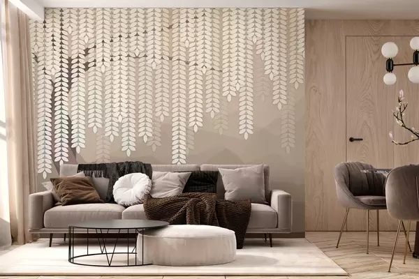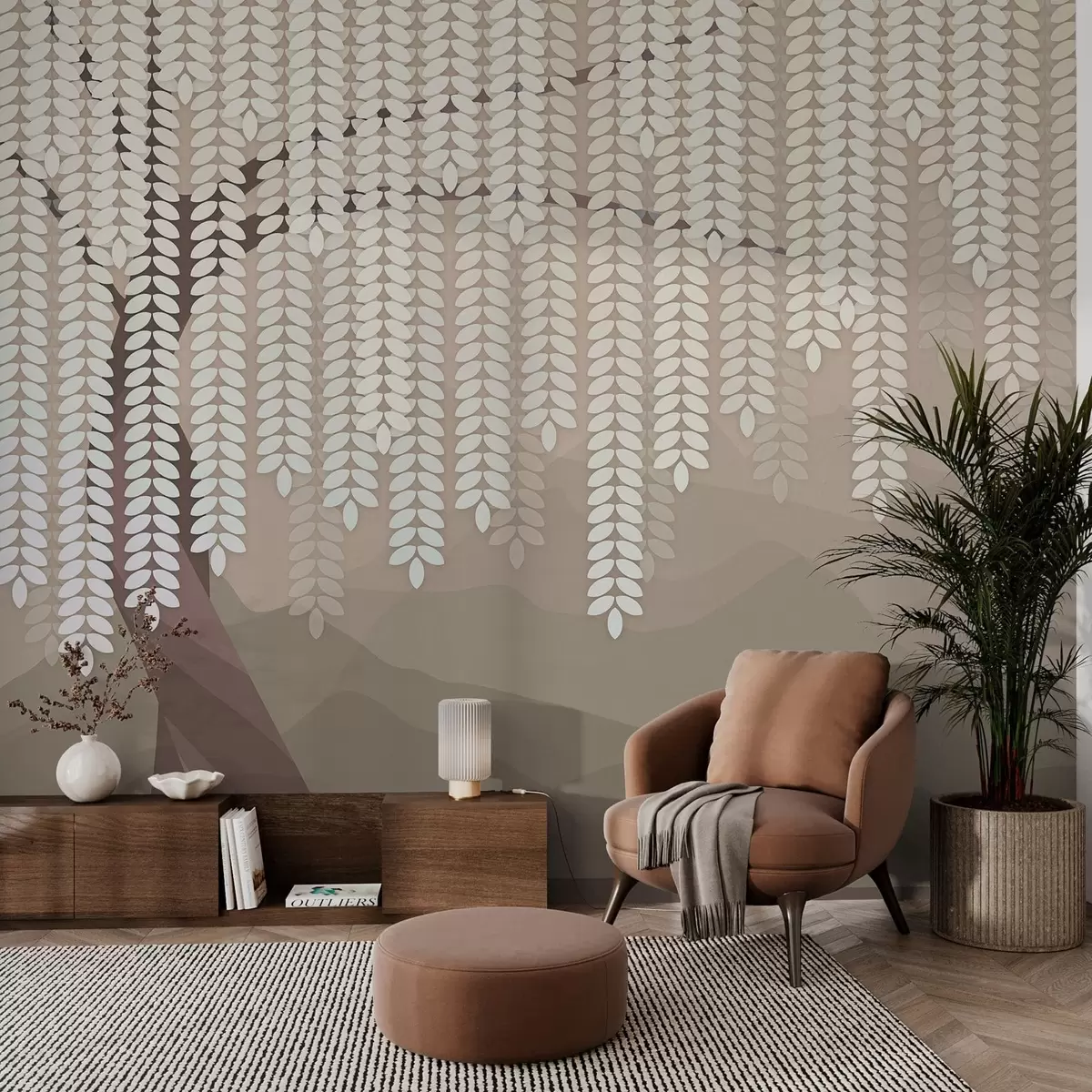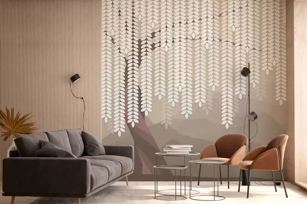 Carta da parati salice stilizzato con foglie pendenti su uno sfondo di montagne minimaliste nei toni del caffè nr. w05232v2