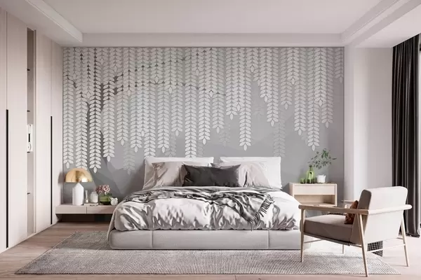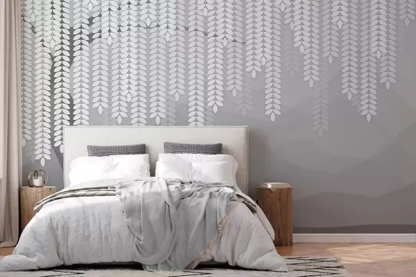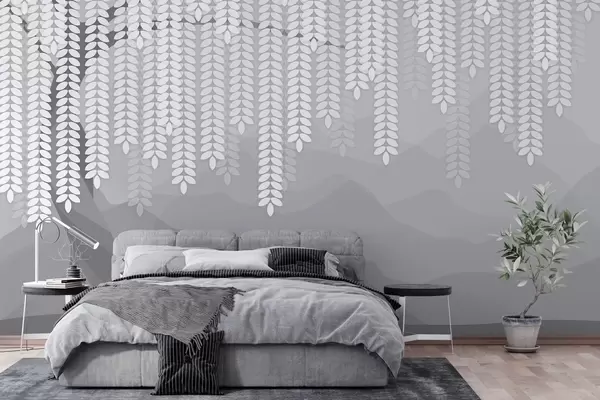 Carta da parati salice stilizzato con foglie pendenti su uno sfondo di montagne minimaliste nei toni del grigio nr. w05232v3