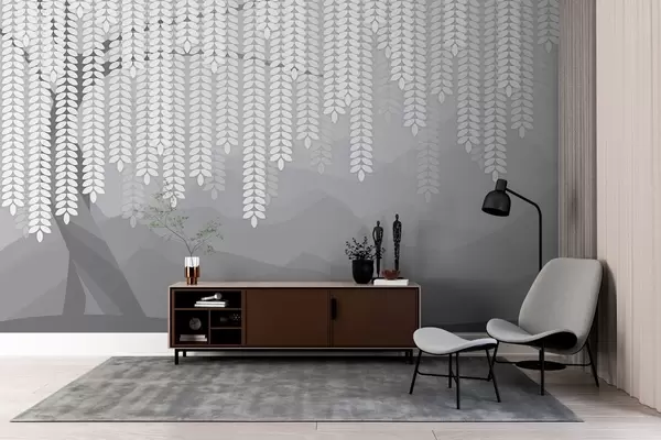 Carta da parati salice stilizzato con foglie pendenti su uno sfondo di montagne minimaliste nei toni del grigio nr. w05232v3