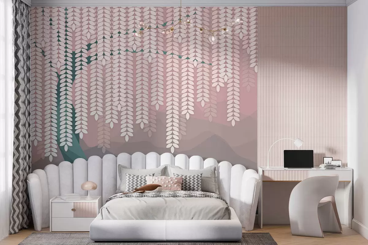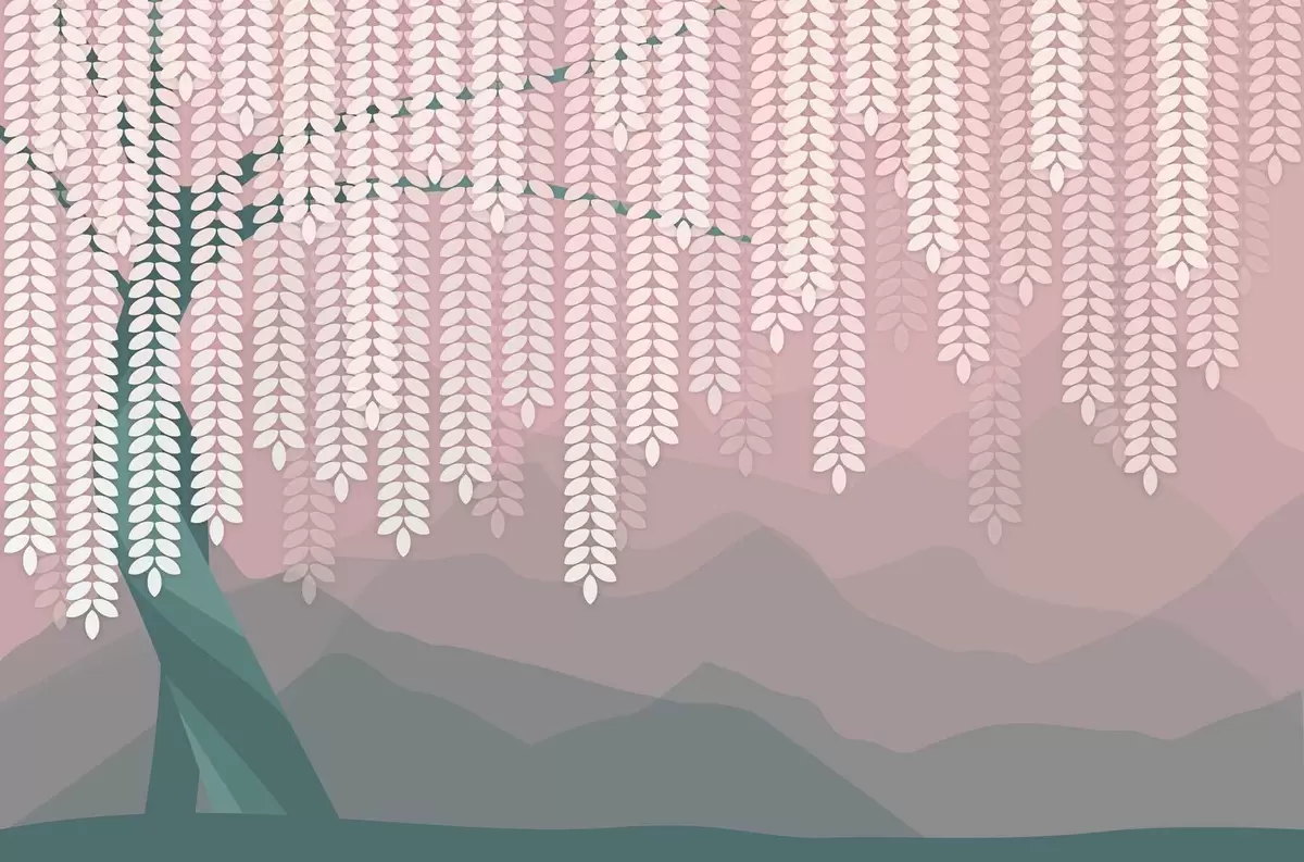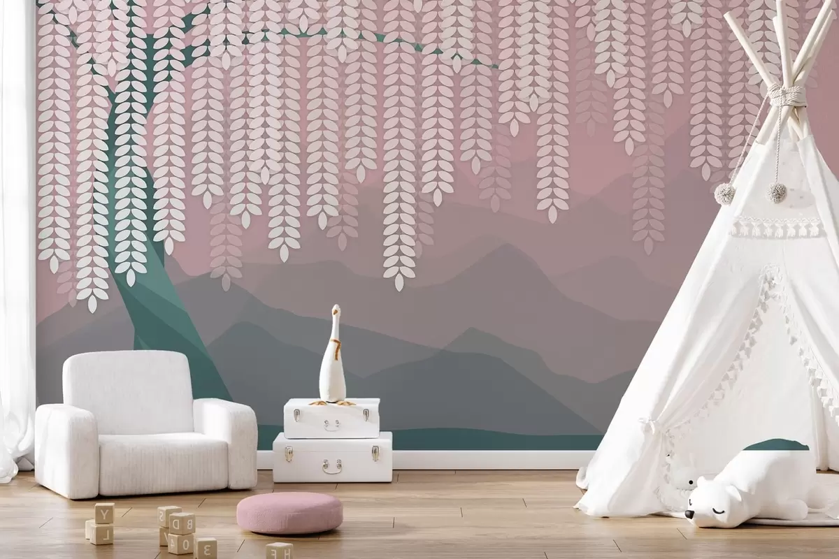 Carta da parati salice stilizzato con foglie pendenti su uno sfondo di montagne minimaliste nei toni del rosa e del verde scuro nr. w05232v4