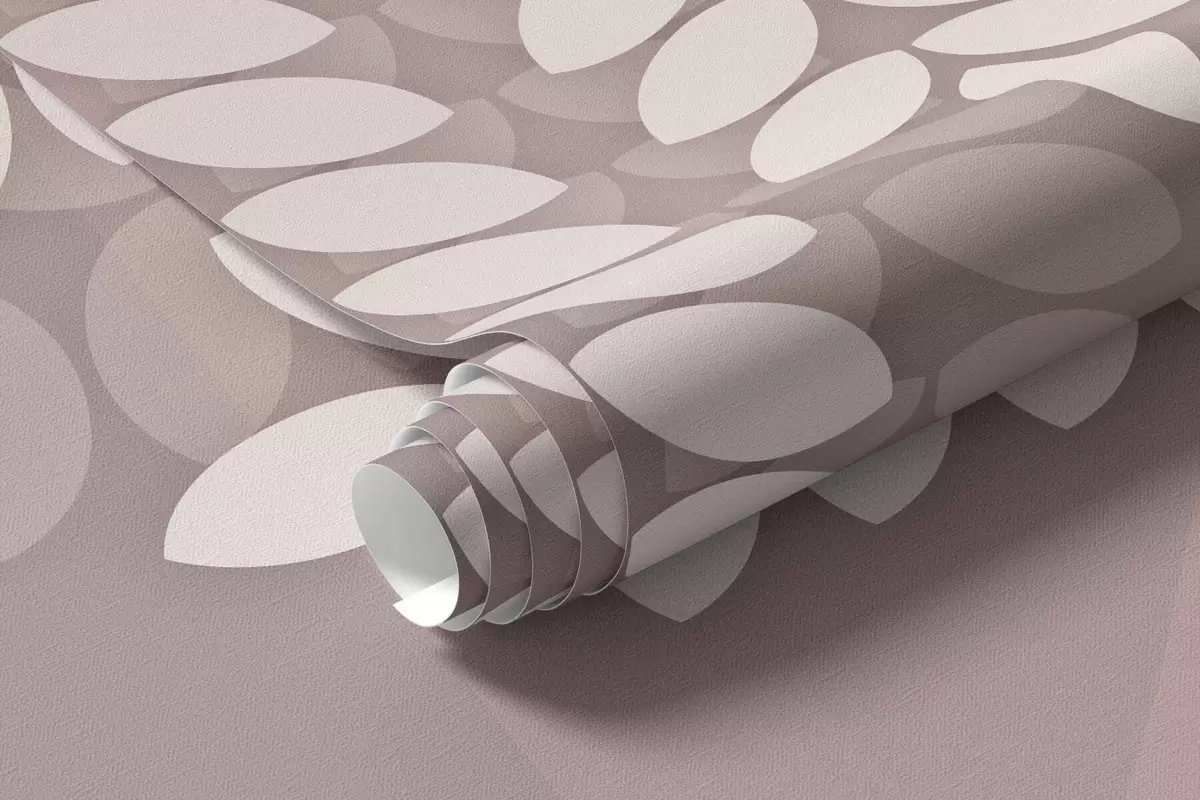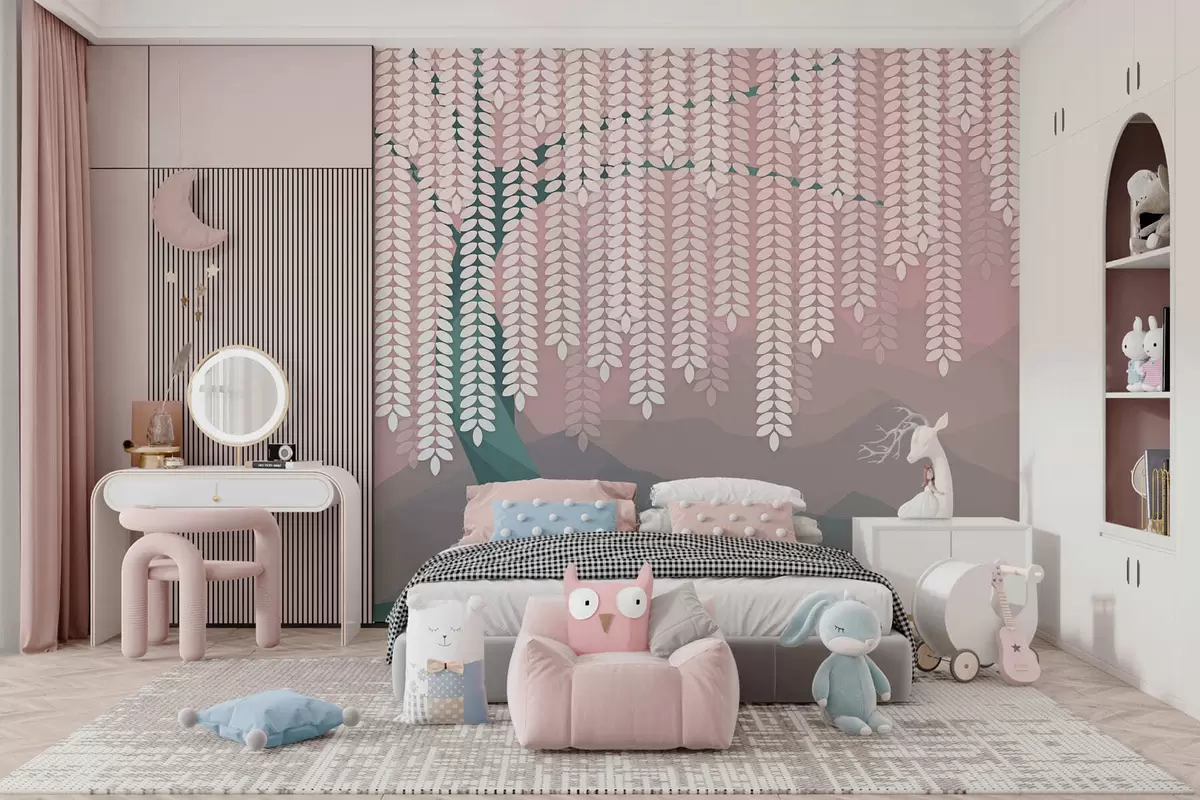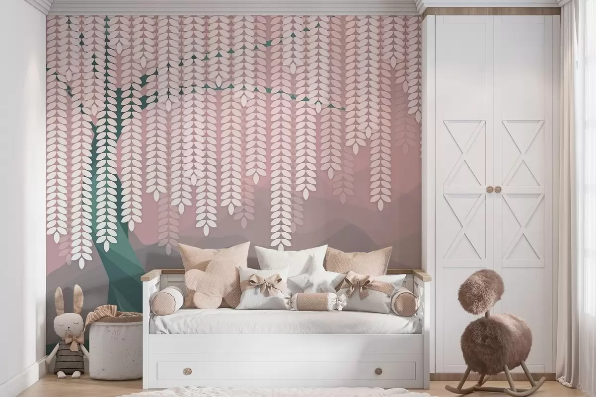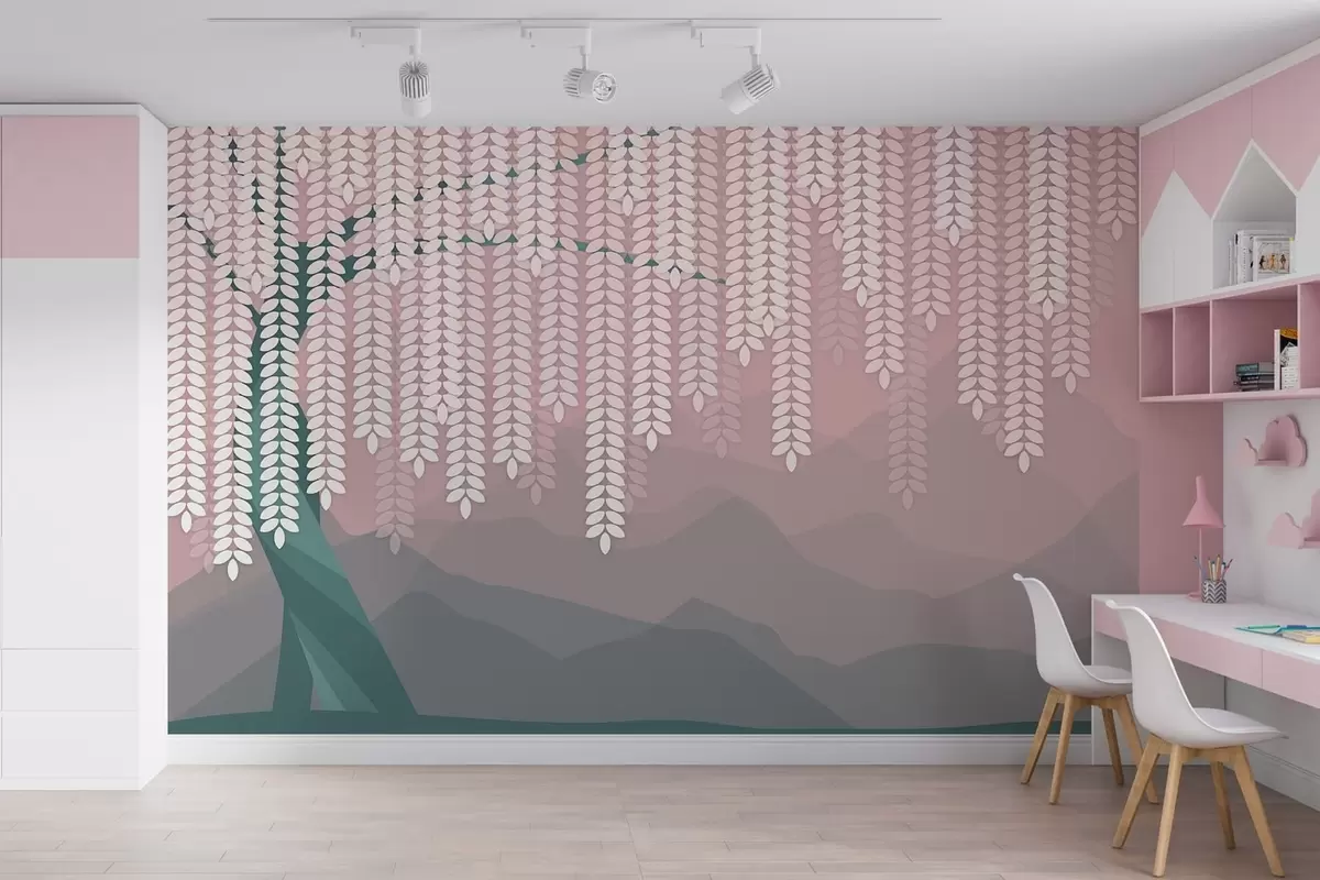 Carta da parati salice stilizzato con foglie pendenti su uno sfondo di montagne minimaliste nei toni del rosa e del verde scuro nr. w05232v4