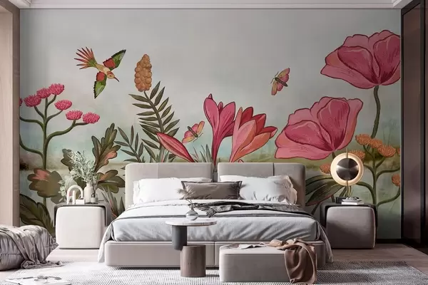 Carta da parati Fiori dai colori vivaci con uccelli e farfalle nr. w05321
