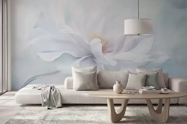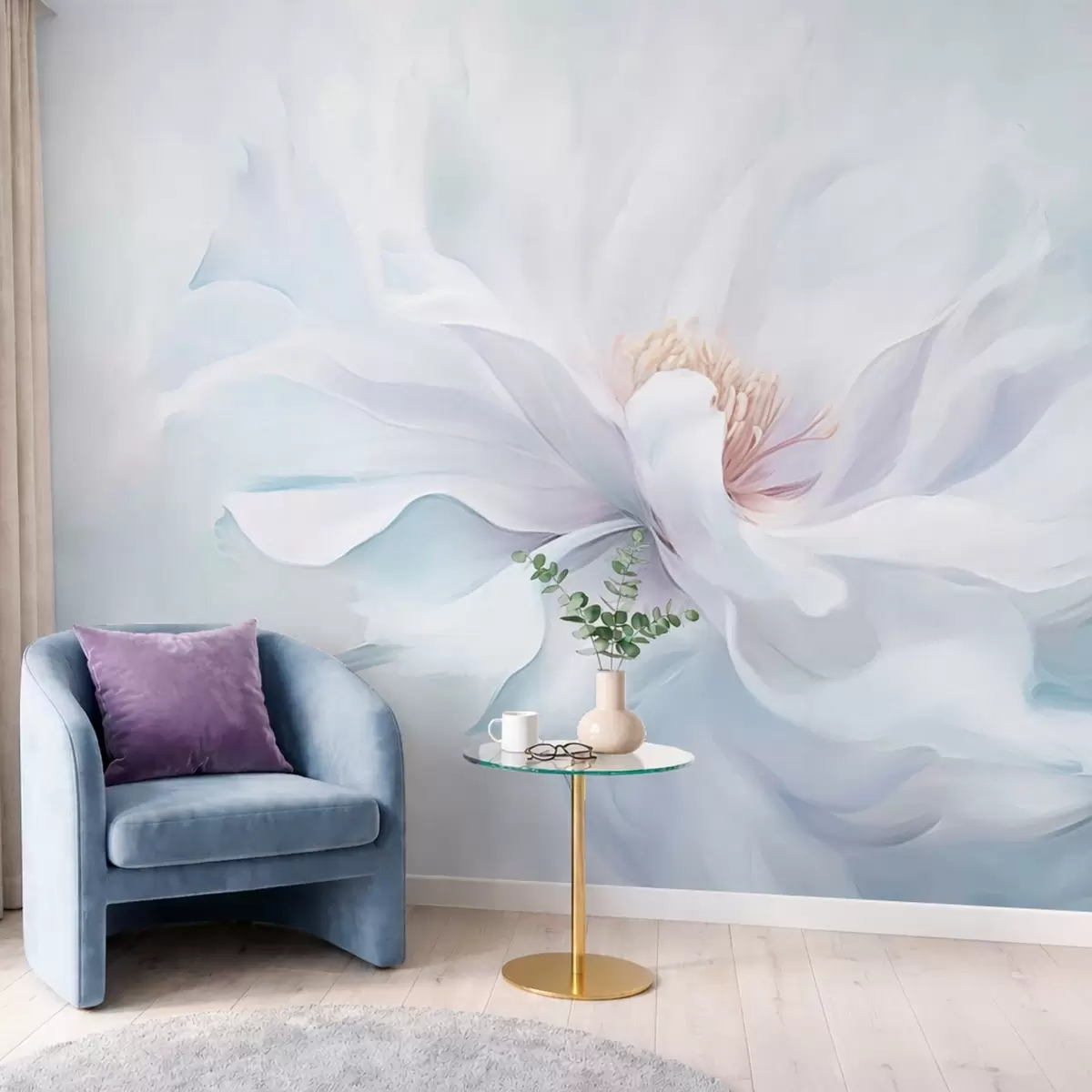 Carta da parati Fiore bianco morbido con petali fluenti su sfondo blu nr. w05354
