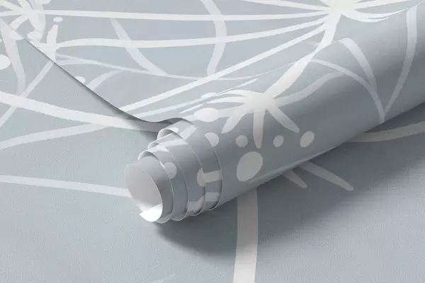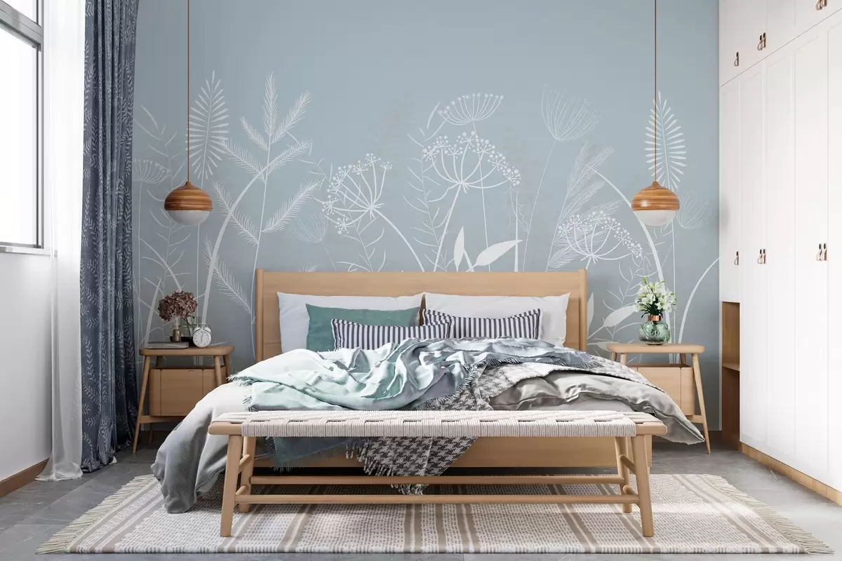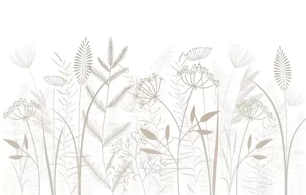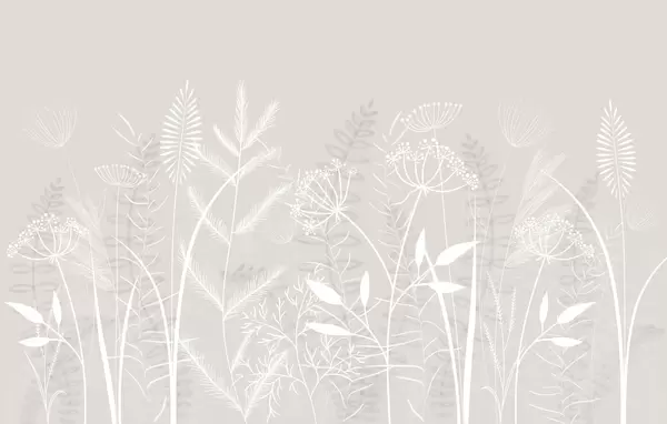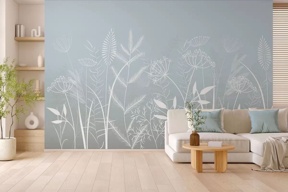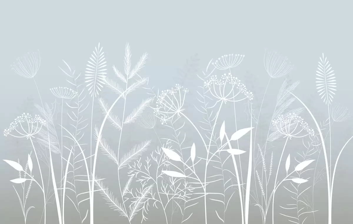 Carta da parati delicati fiori e erbe selvatiche dipinti a mano su uno sfondo grigio-blu nr. w05383