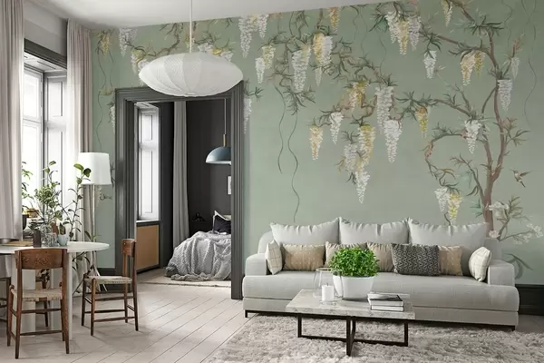 carta da parati Rami fioriti con fiori bianchi e uccellini su sfondo verde nr. w05394