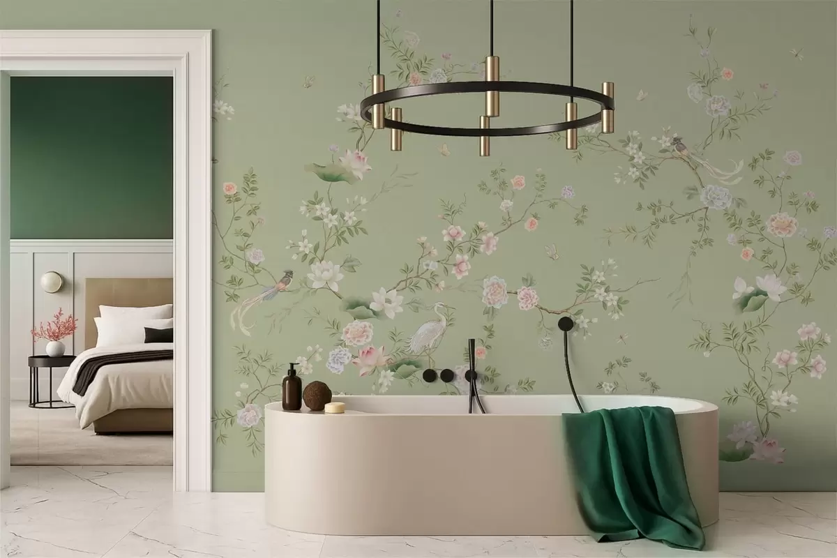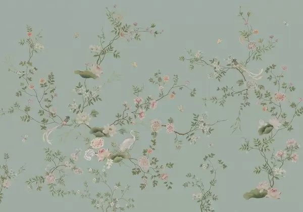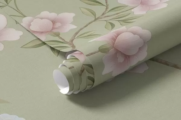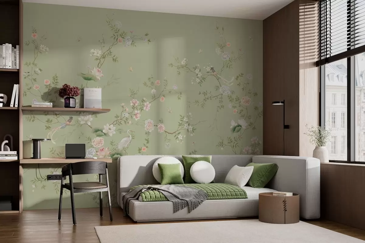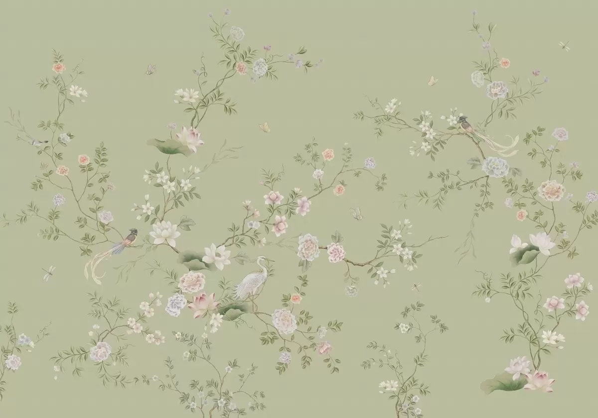 Carta da parati Rami in fiore con uccellini su sfondo verde chiaro nr. w05416
