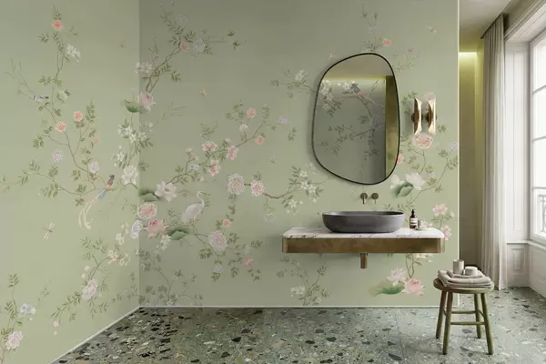 Carta da parati Rami in fiore con uccellini su sfondo verde chiaro nr. w05416