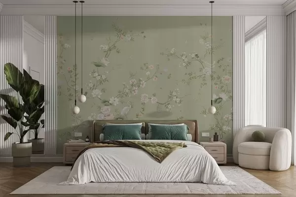 Carta da parati Rami in fiore con uccellini su sfondo verde chiaro nr. w05416