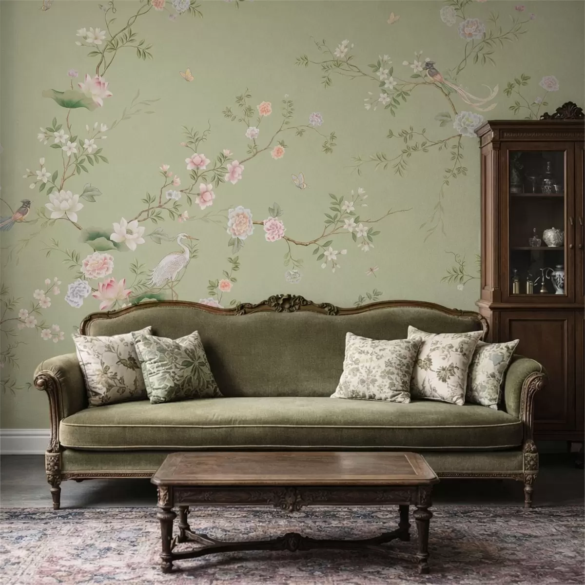 Carta da parati Rami in fiore con uccellini su sfondo verde chiaro nr. w05416