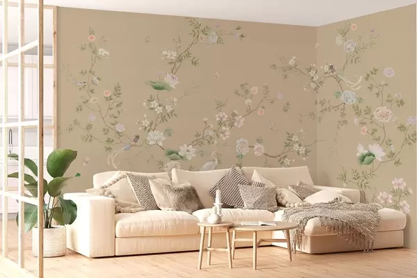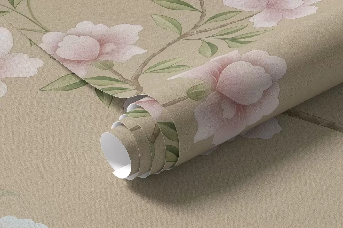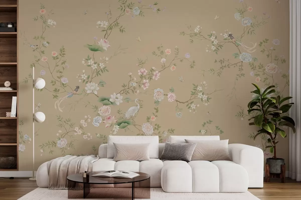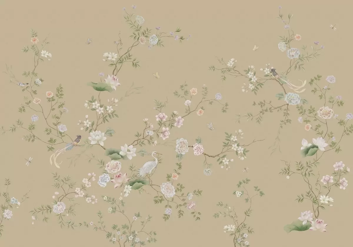Carta da parati Rami in fiore con uccellini su sfondo beige caldo nr. w05416v2