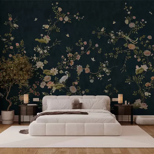 Carta da parati Rami in fiore con uccelli su sfondo scuro nr. w05416v3