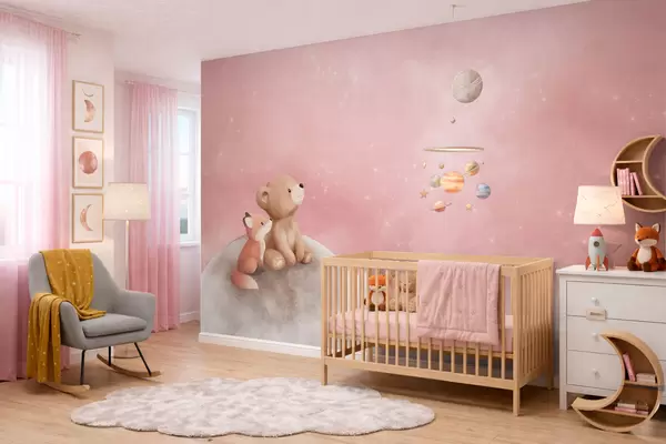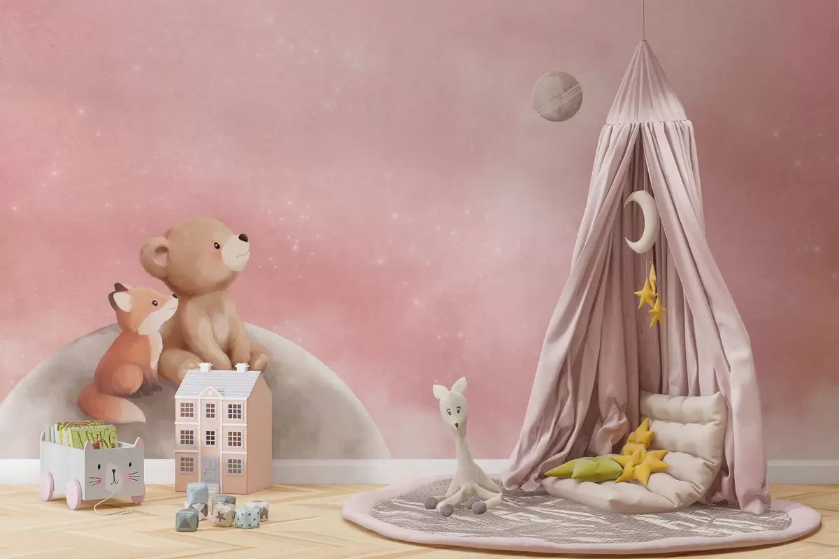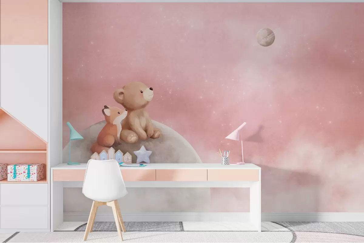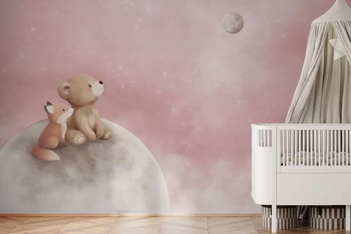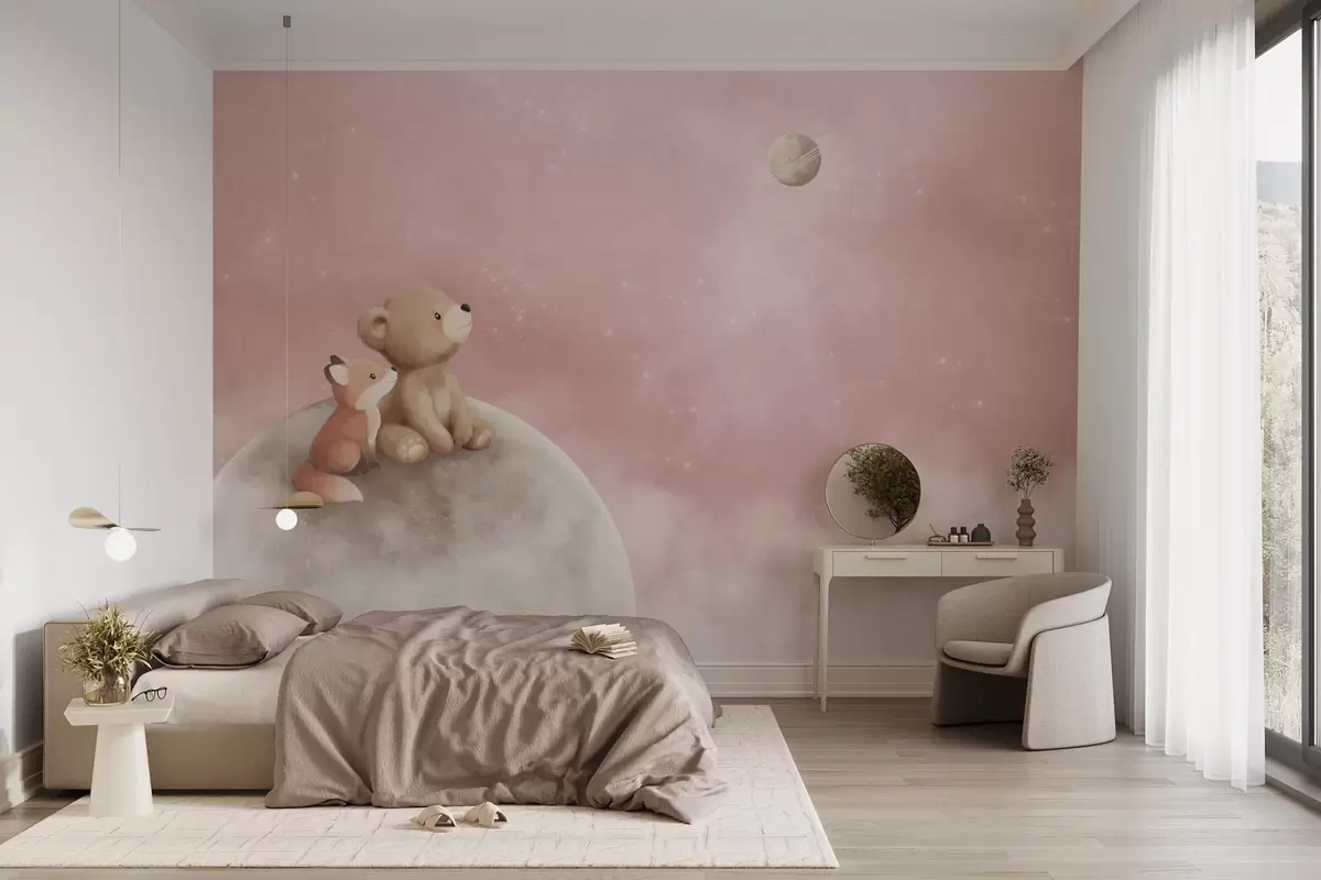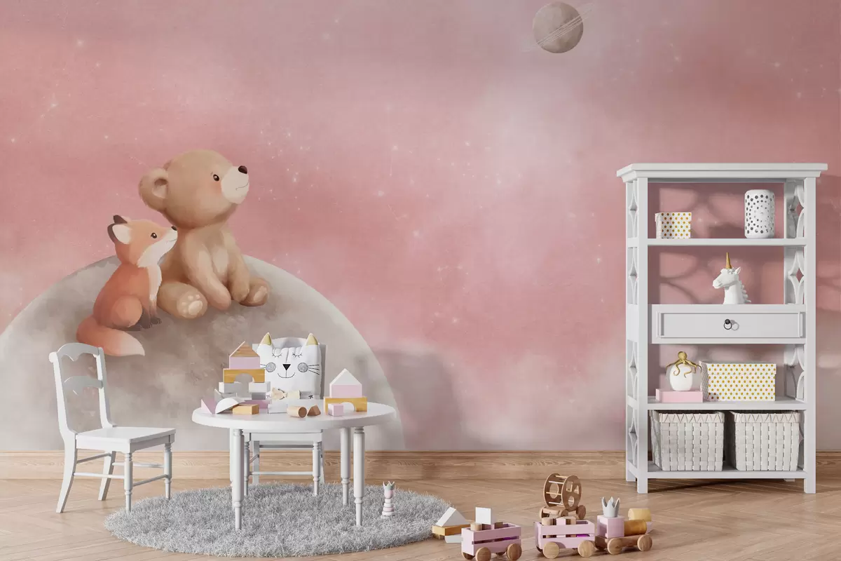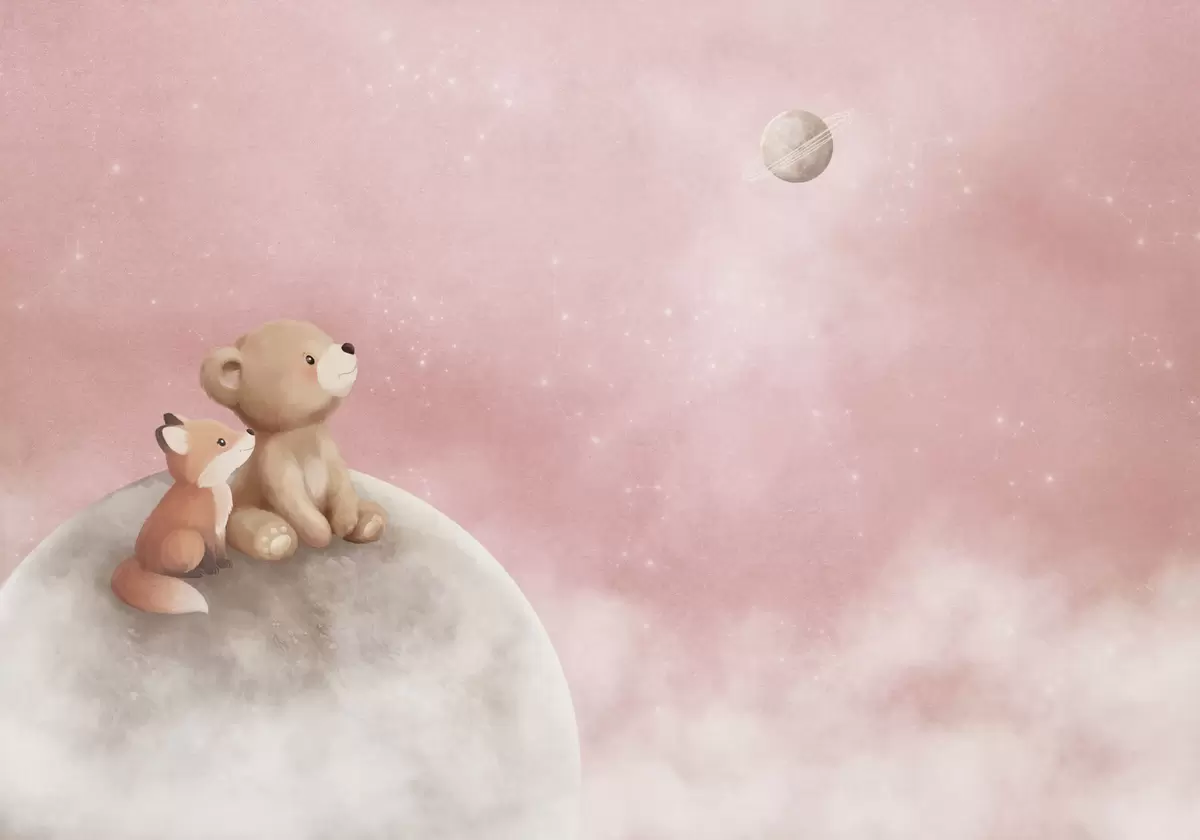 Carta da parati Illustrazione a pastello con un orso e una volpe su uno sfondo rosa con la luna nr. w05431v2