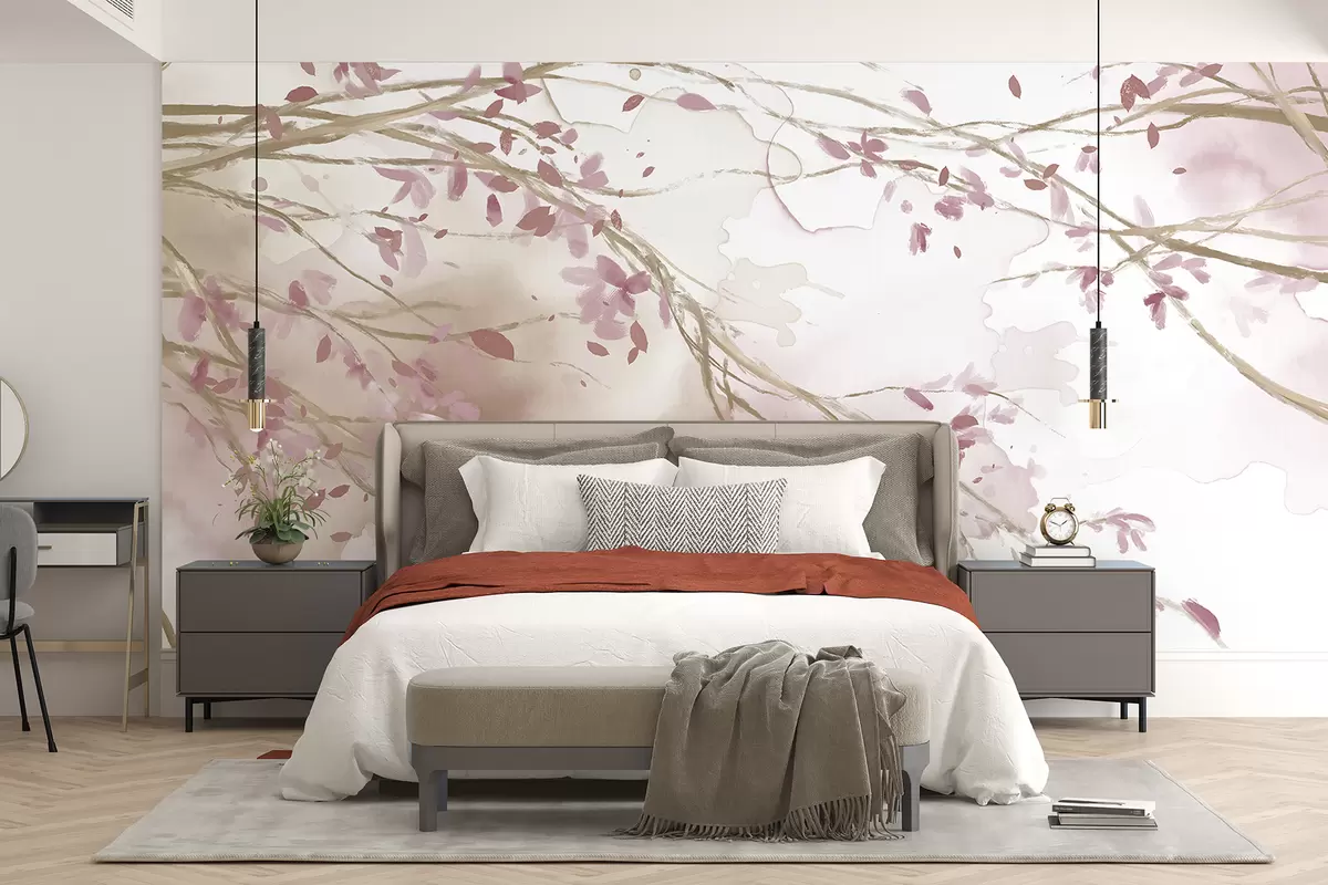 Carta da parati Delicati rami floreali rosa e bianchi con sfondo acquerello morbido e sfocato nr. w07919v1