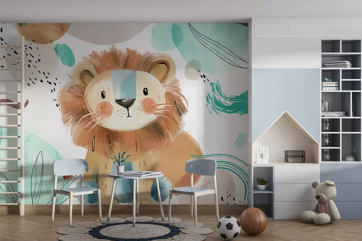 Carta da parati Un simpatico leone cartone animato su uno sfondo colorato e astratto con pennellate e schizzi di colori pastello nr. w07924
