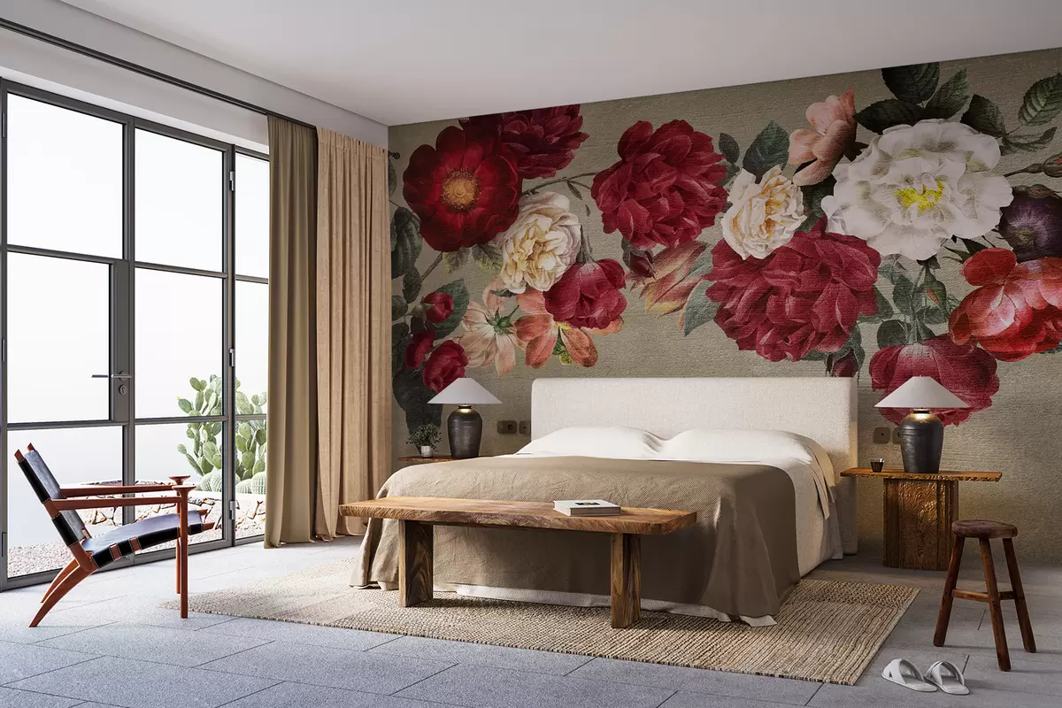 Carta da parati Fiori vibranti d'arte vintage con foglie su uno sfondo con texture neutra nr. w07929