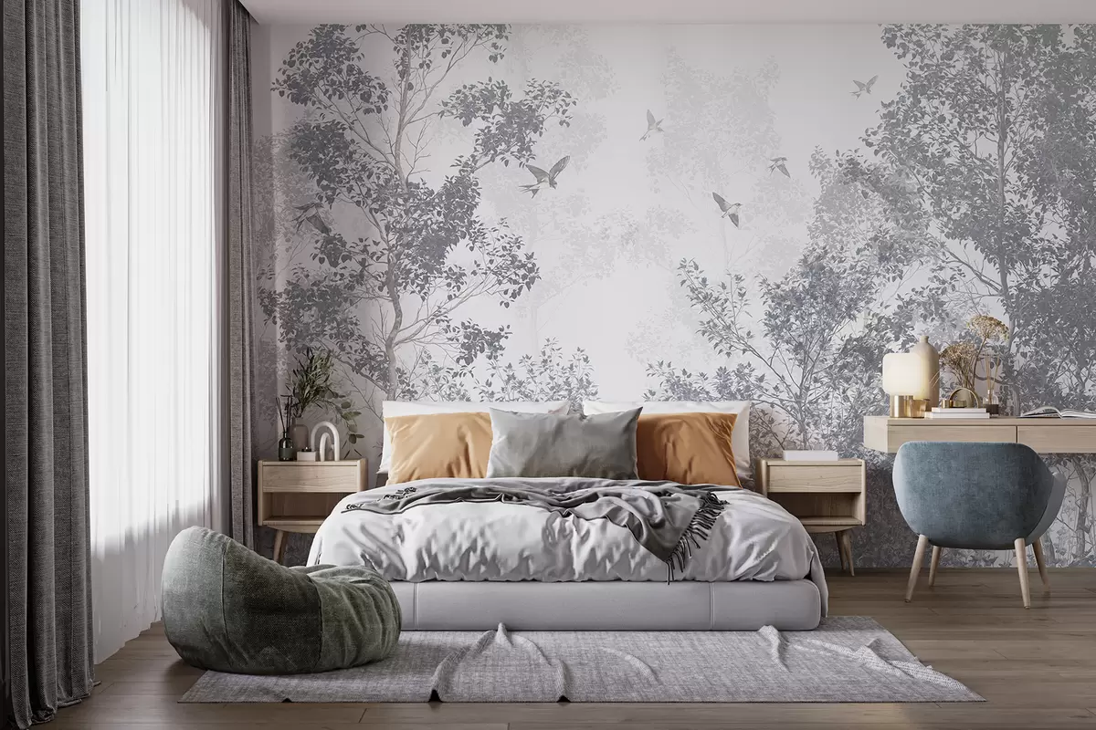 Carta da parati Alberi con foglie e rami grigi con uccelli che volano nel cielo, sfondo bianco nr. w07982v1