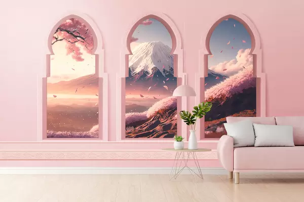 Carta da parati Grandi finestre in stile orientale con vista mozzafiato sul Monte Fuji in tenue color pesca nr. w08082