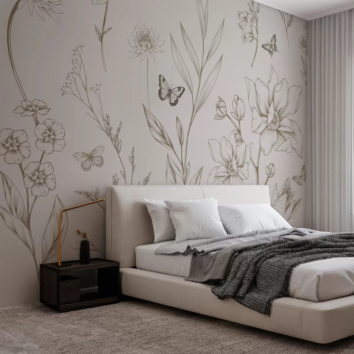 Carta da parati Boho Fiori e farfalle monocromatici in colore beige nr. w08088v1