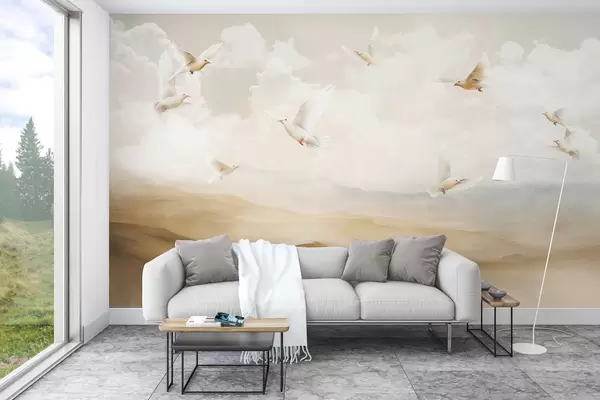 Carta da parati Uccelli che volano nel cielo con nuvole, paesaggio naturale, disegno acrilico, colori pastello beige nr. w08143