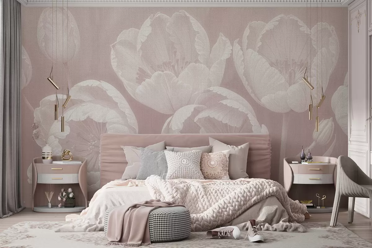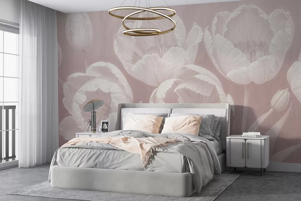 Carta da parati Disegno di tulipani bianchi con sfondo beige sfocato, morbido e strutturato in tela, stampa monocromatica minimalista nr. w08193