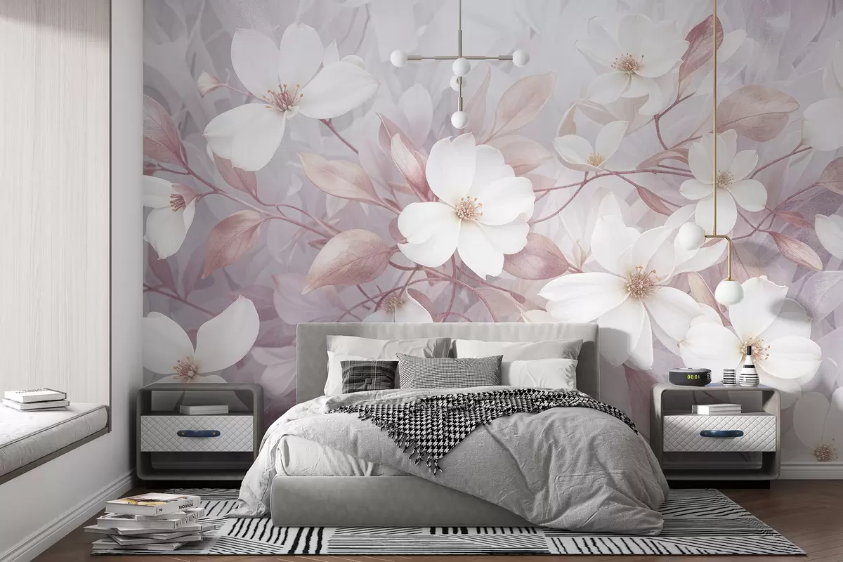 Carta da parati Delicati fiori di magnolia rosa e bianchi che sbocciano su rami morbidi e sfocati su uno sfondo pallido nr. w08196