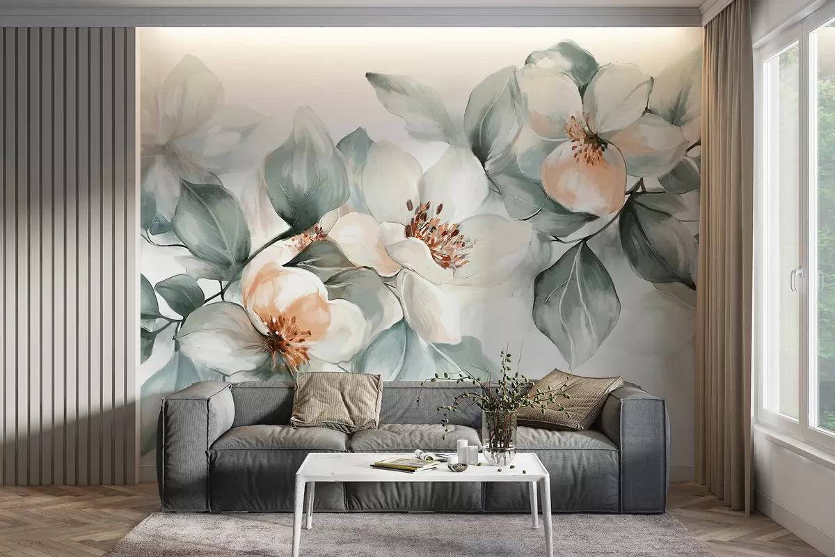 Carta da parati Delicati fiori di magnolia bianchi e rosa con foglie verde tenue su uno sfondo chiaro nr. w08220