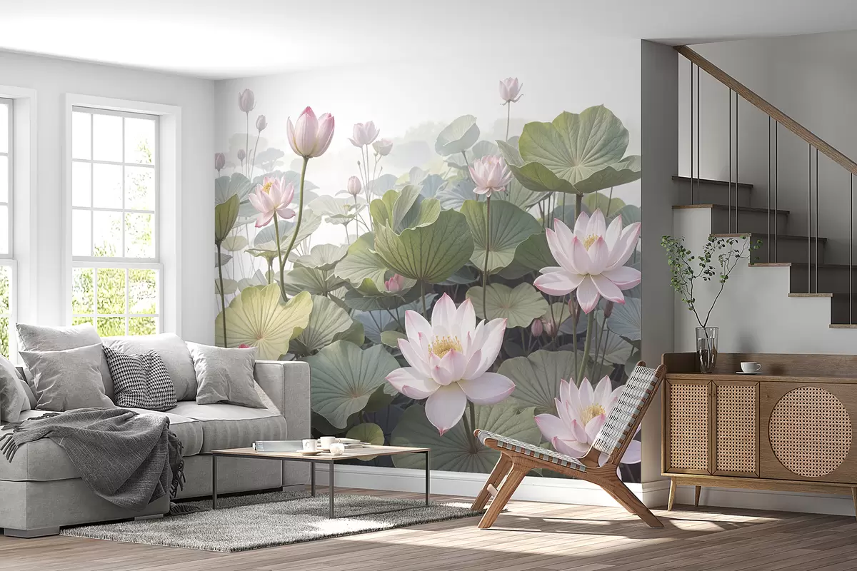 Carta da parati Fiori di loto rosa e bianchi con grandi foglie verdi, circondati da uno sfondo nebbioso e atmosferico nr. w08221