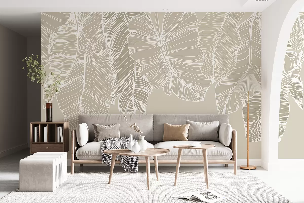 Carta da parati Foglie floreali tropicali bianche con sfondo beige chiaro, design minimalista di linee artistiche nr. w08235