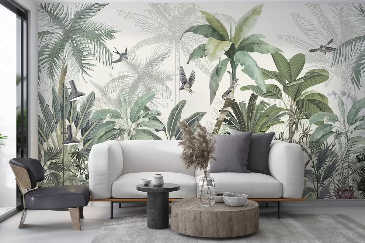 carta da parati Una lussureggiante scena di giungla tropicale con varie palme, grandi foglie e fiori colorati in primo piano nr. w08239