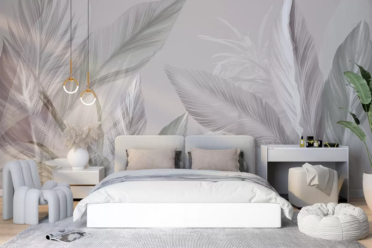 Carta da parati Morbide piume bianche, rosa e grigie e foglie tropicali che fluttuano su uno sfondo chiaro nr. w08241v1