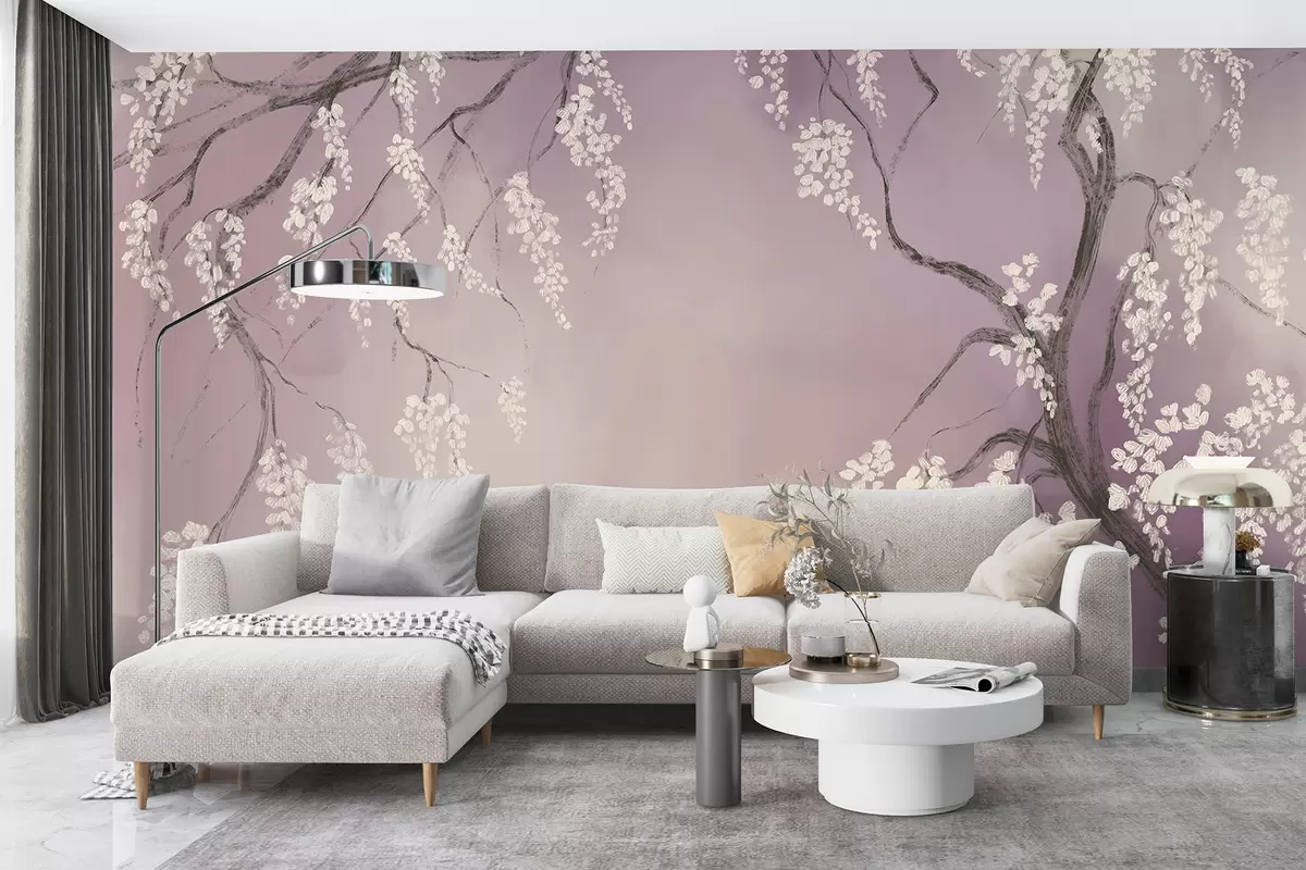 Carta da parati Delicato ciliegio bianco con fiori in fiore che sbocciano sui rami su sfondo rosa nr. w08243v2