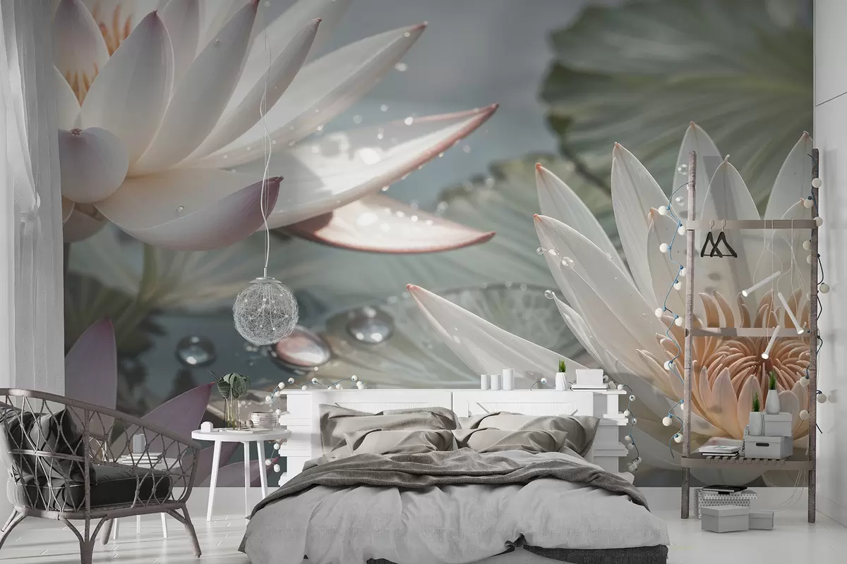 Carta da parati Un primo piano di fiori di loto bianchi con gocce d'acqua sui petali su uno sfondo verde sfocato nr. w08252